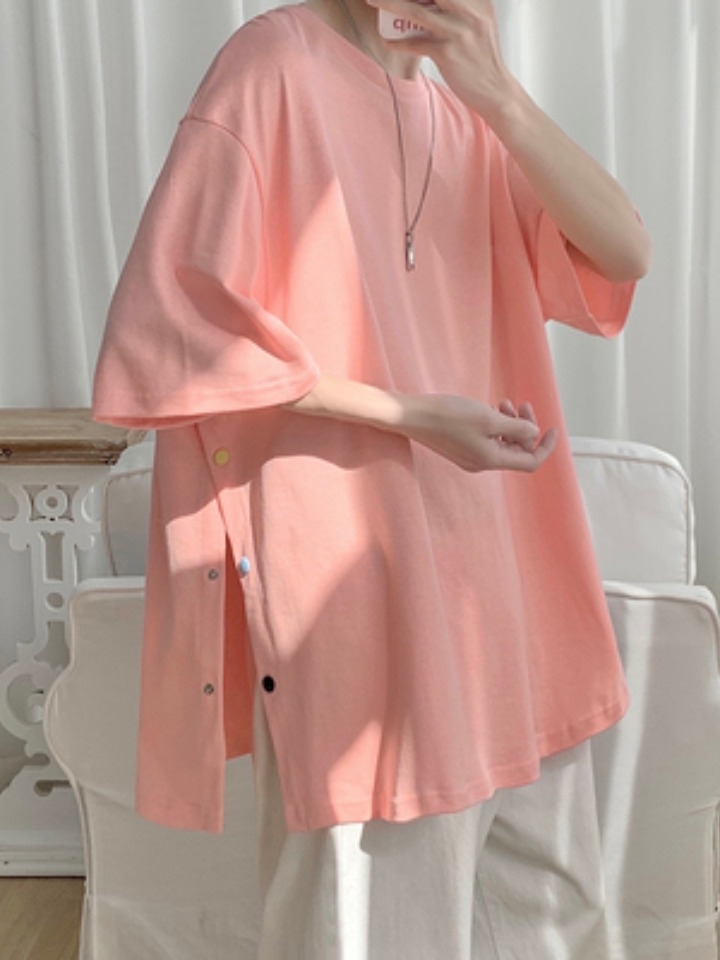简约的纯色,清新靓丽,优雅的圆领设计,衬托颈部优美线条,宽松显瘦的版型,轻松遮肉,性感的下摆开叉设计,彰显个性。