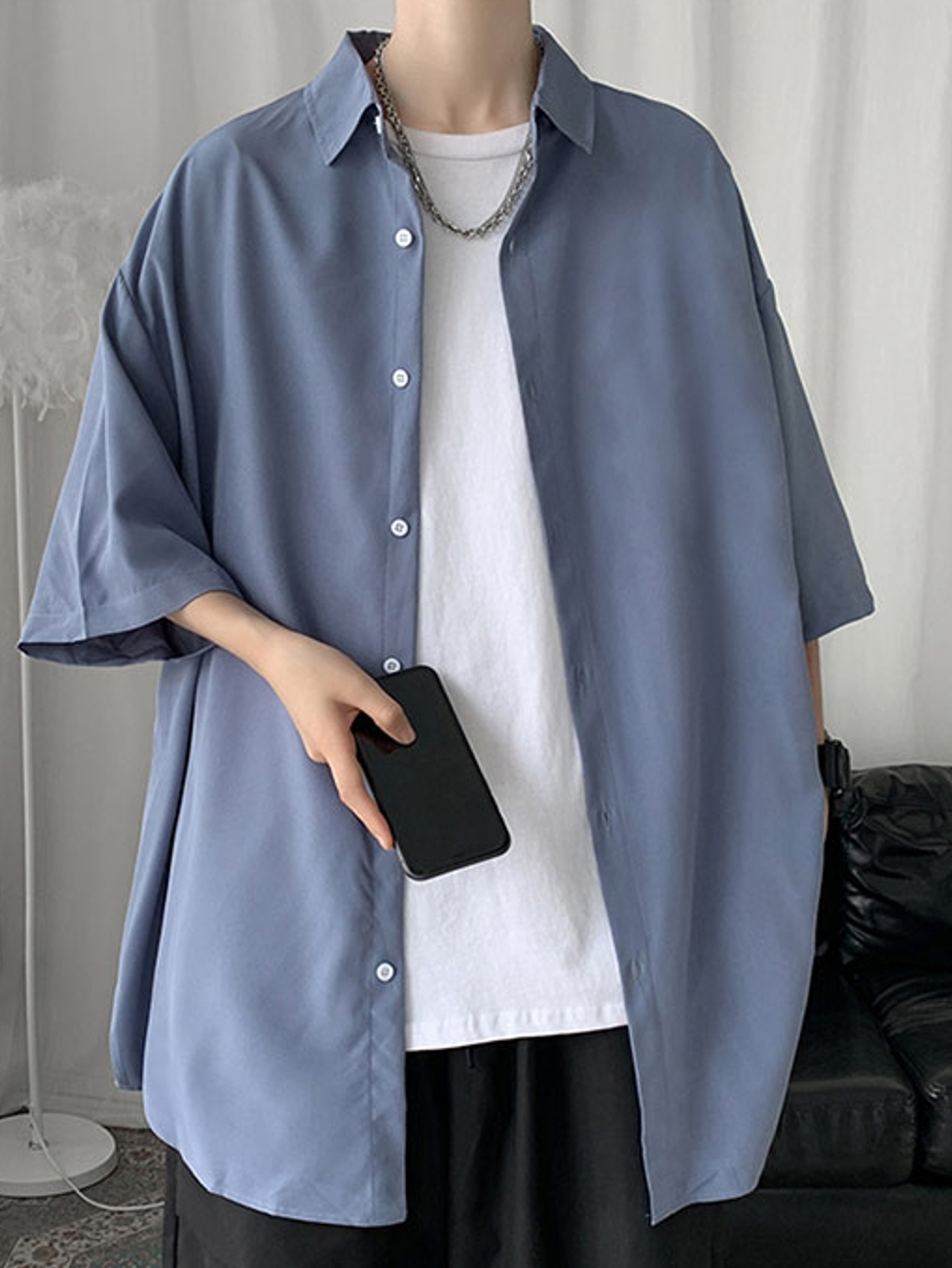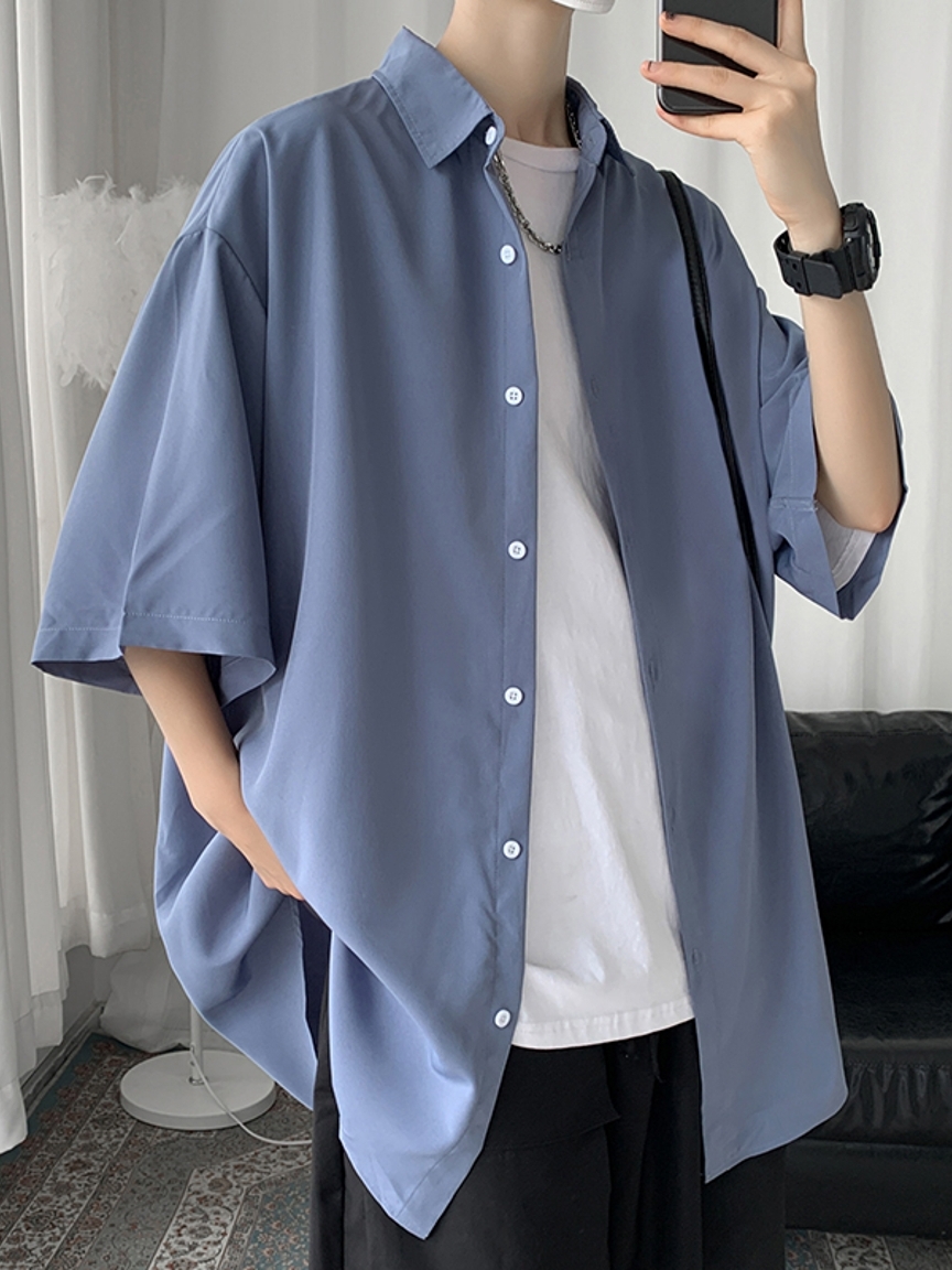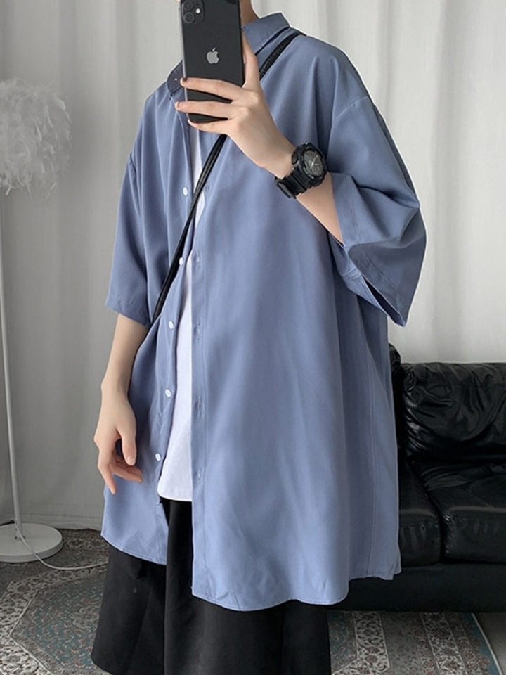 蓝色衬衫,像极了大海的颜色,清新有十分的爽朗,衣服扣子也是蓝色和衣服很般配,整体美观又时尚。