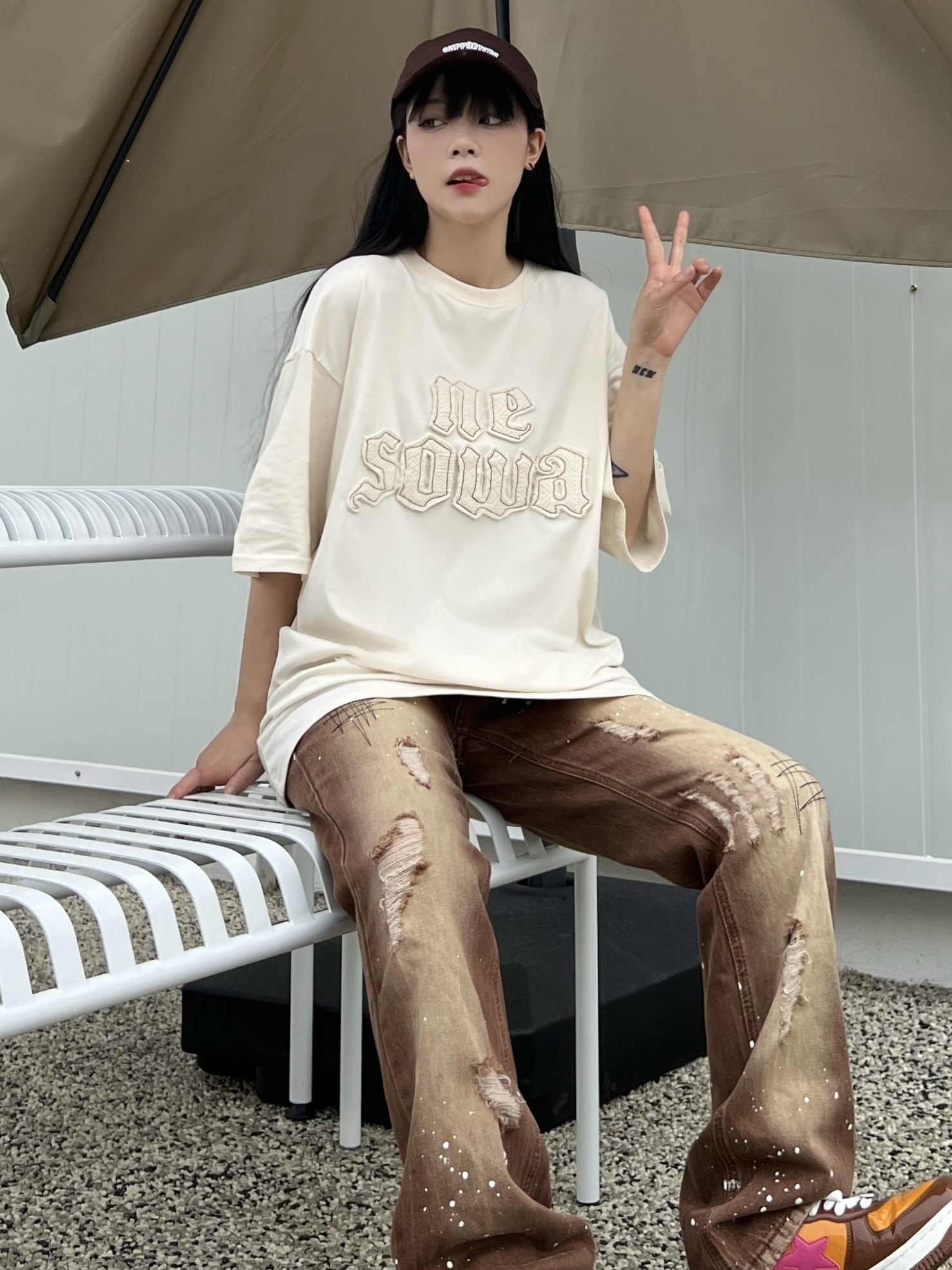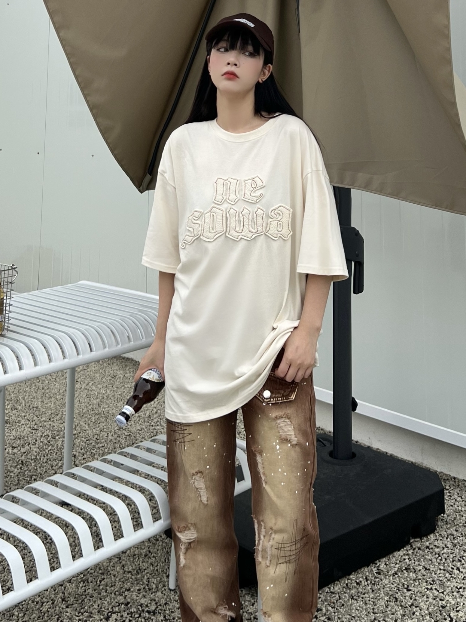 这款t恤是简约的风格,宽松的版型,时尚百搭,胸前的字母印花,很有个性,搭配牛仔裤或者短裤都很好看。