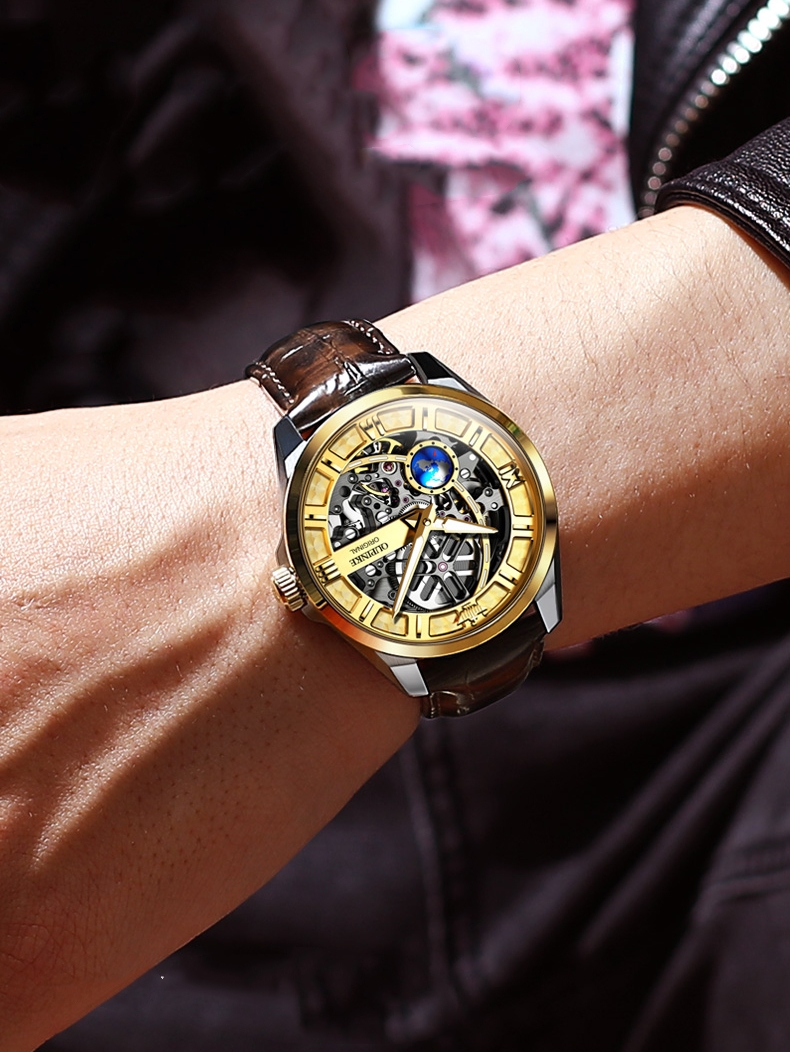 作为一款体现机械工艺之美的单一产品,其干练自然的造型深受大众喜爱。这款自动手表采用0自动机械,机芯表盘采用全镂空设计,背面雕刻参数。