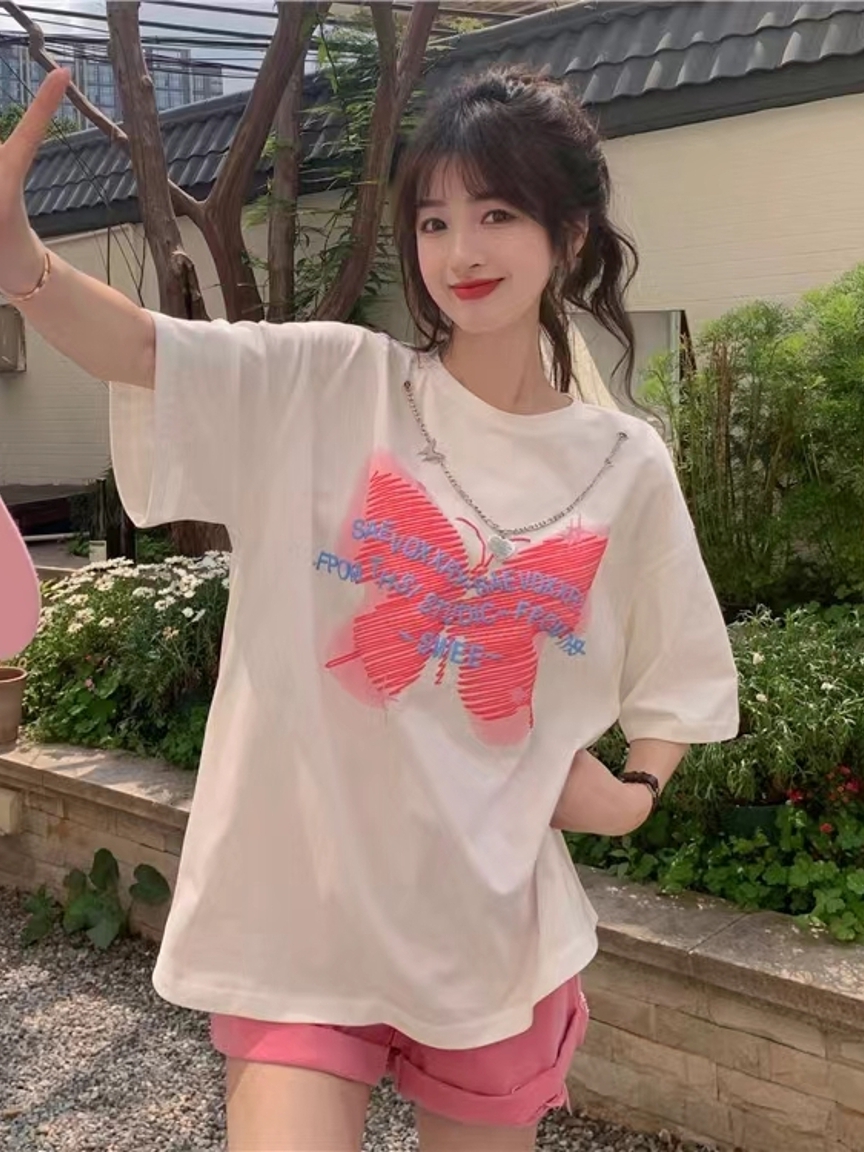 它胸前撞色的蝴蝶的图案点缀是最吸引我的了,带有着天鹅米温柔的气息,还十分吸睛夺目的,领口链条的元素,更具时尚潮流感。