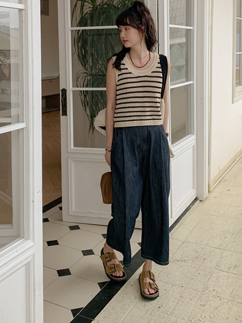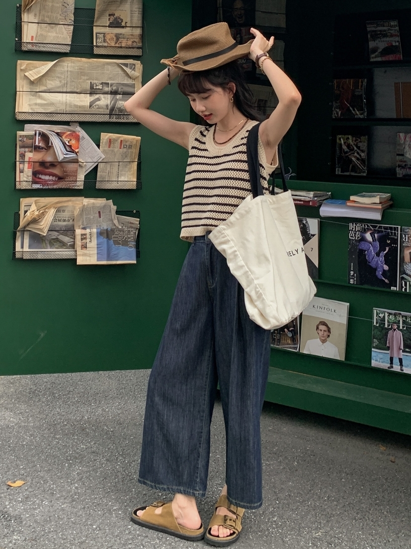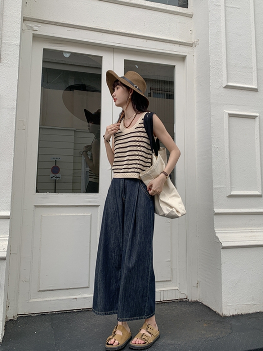 很显气质的宽松款牛仔裤。宽松的阔腿版型,美化腿部线条,上身遮肉显瘦,具有干练利落的气场。宽松的九分裤版型,微露脚踝有着非常好的显瘦显高效果,通勤外出利用率优先选择款!。简约的高腰身,实穿性高,穿脱便捷,上身不挑身材哦。