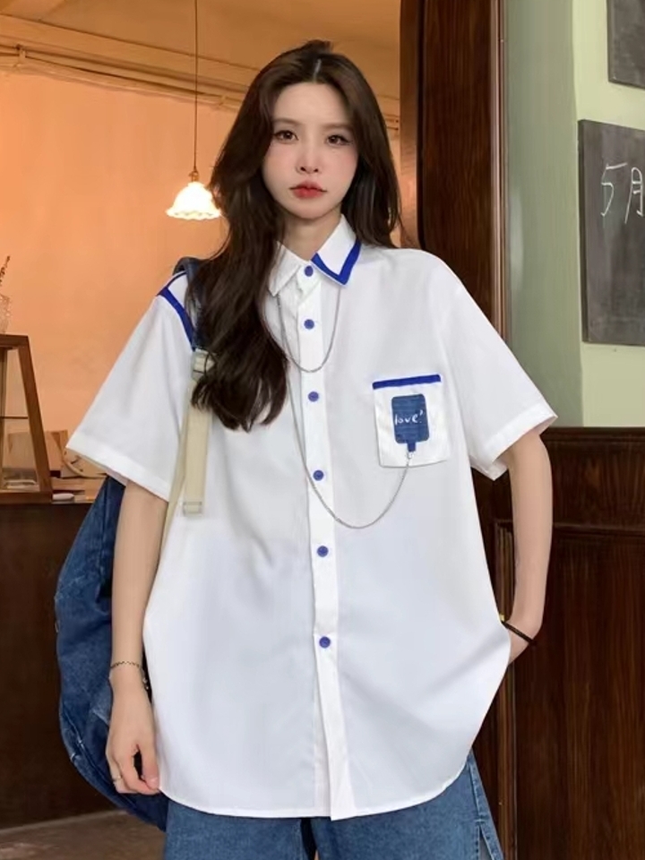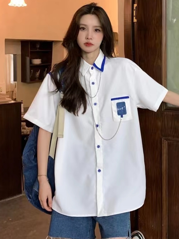 白色的衬衫款式,久穿不易过时,同时也很好的衬显了女性的肤色,链条配饰的装点,增添了时髦度,带来了几分帅气之感。