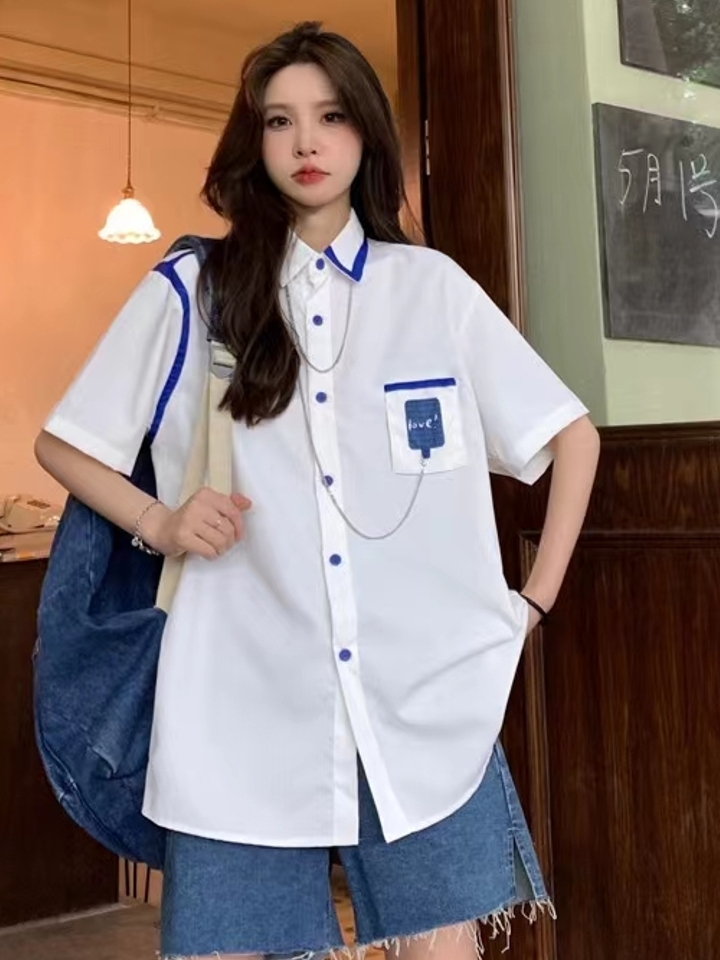 个性独特的衬衫,带着浓郁的法式复古风情,自带时尚潮流气息,衬衫领的设计,显得很是利落有型,边缘处的撞色拼接,时髦度满满的。