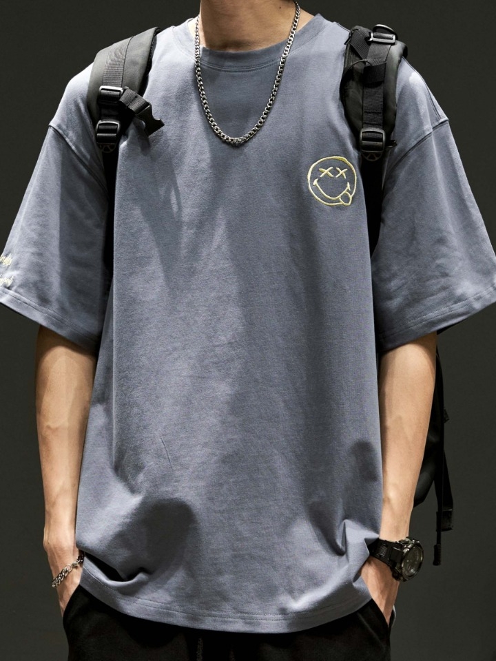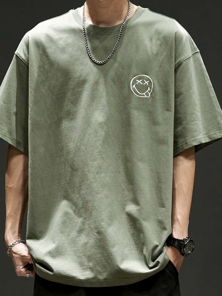 圆领设计,修身显高挑,宽松的版型,穿着起来舒适又遮肉。简洁的短袖加上衣身的笑脸印花设计,上身效果即减龄又很俏皮。