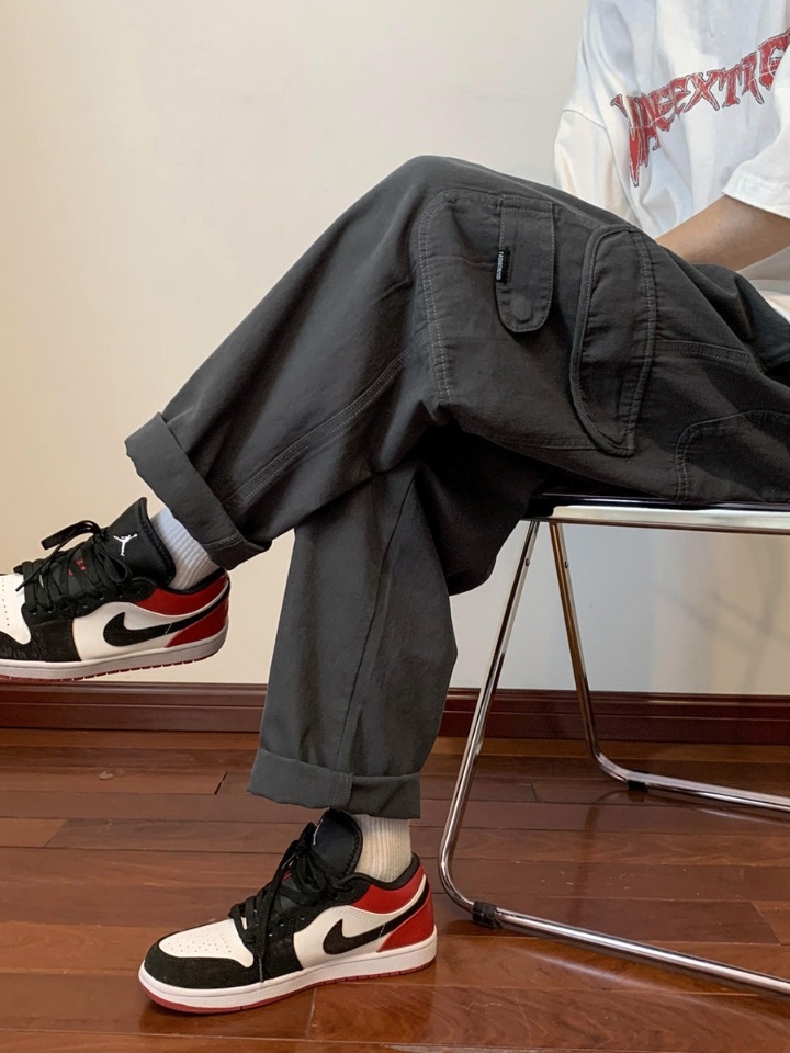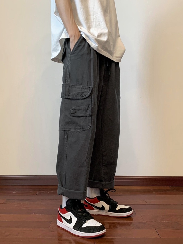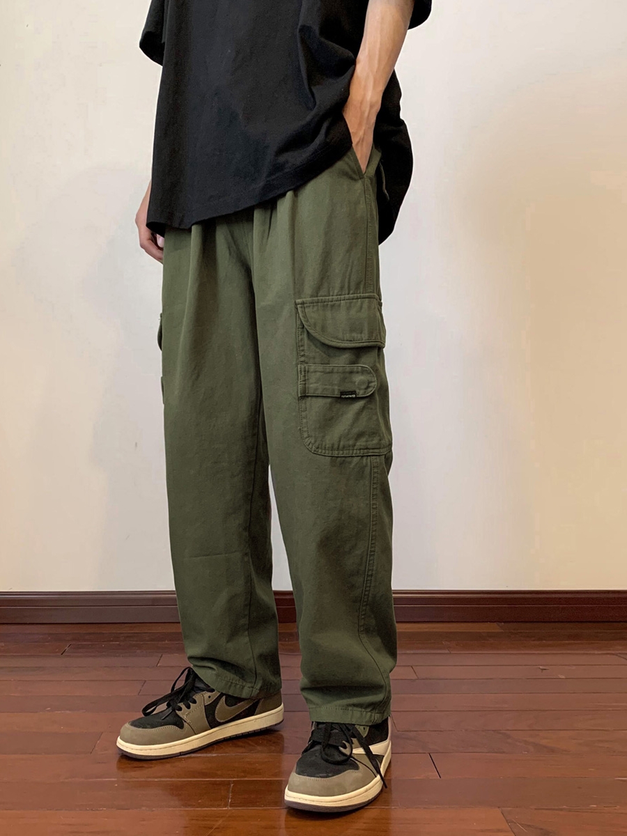 军绿色系本身就带着浓厚的硬汉气质,再加上复古的工装裤版型,两个立体式大口袋,还有两个平铺口袋,实用方又便。