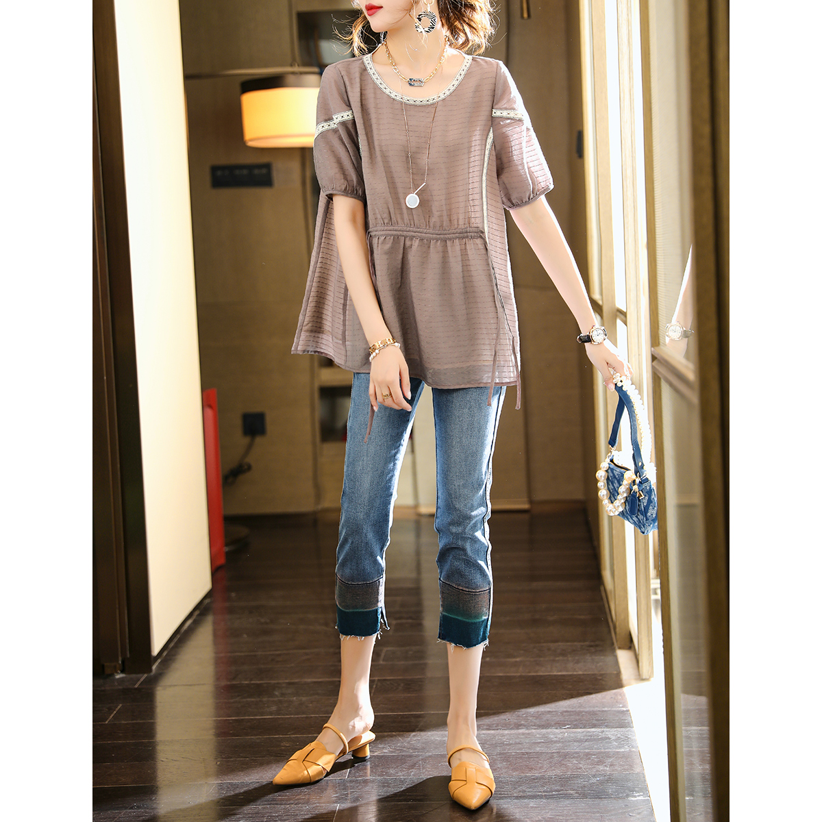 高腰设计,拉长身材比例。高腰牛仔裤,显瘦显腿长。直筒裤型,修饰腿部线条。