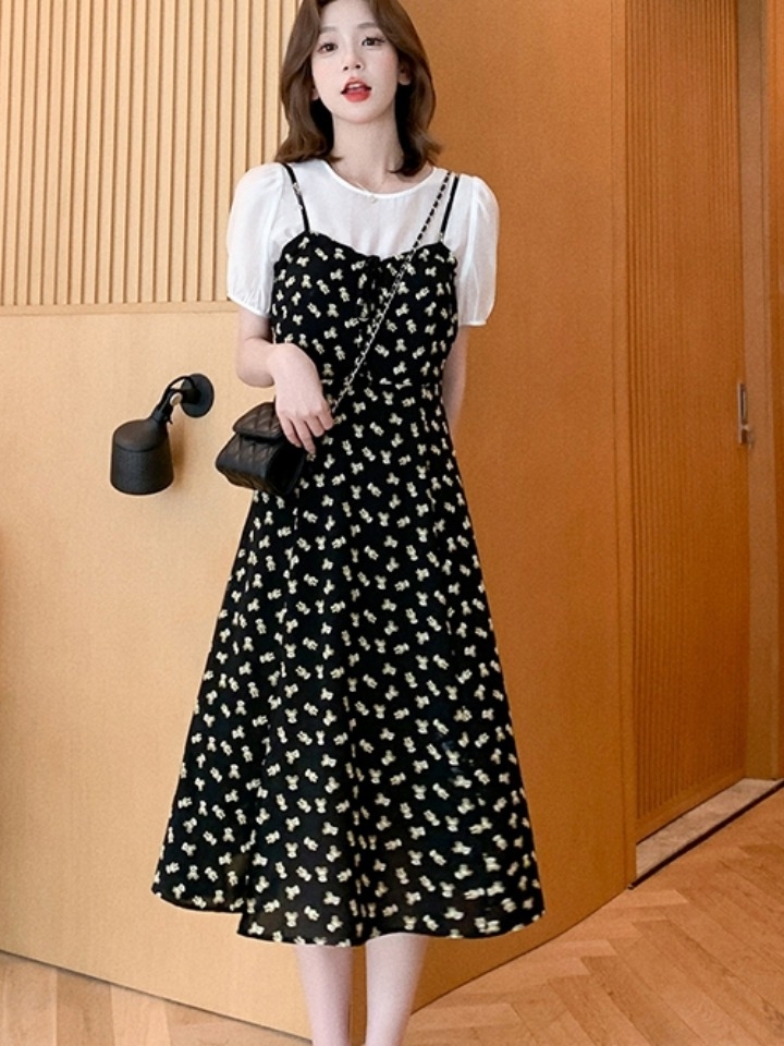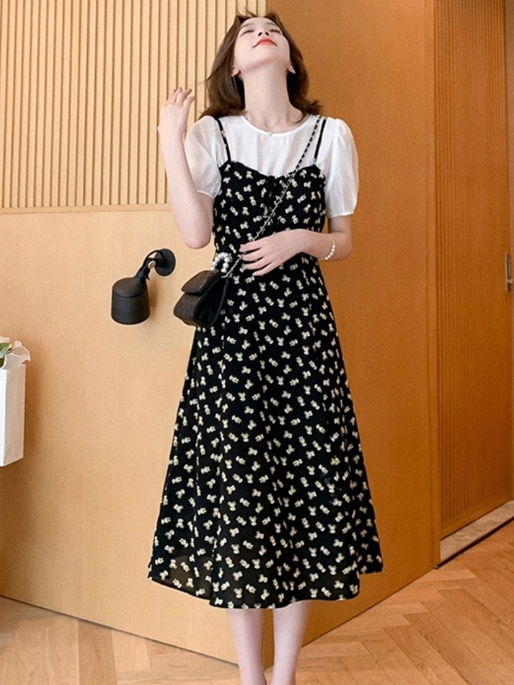 简约百搭的两件套装,内里白色T恤穿着舒适,外搭背带裙俏皮减龄,雪纺面料手感舒适。