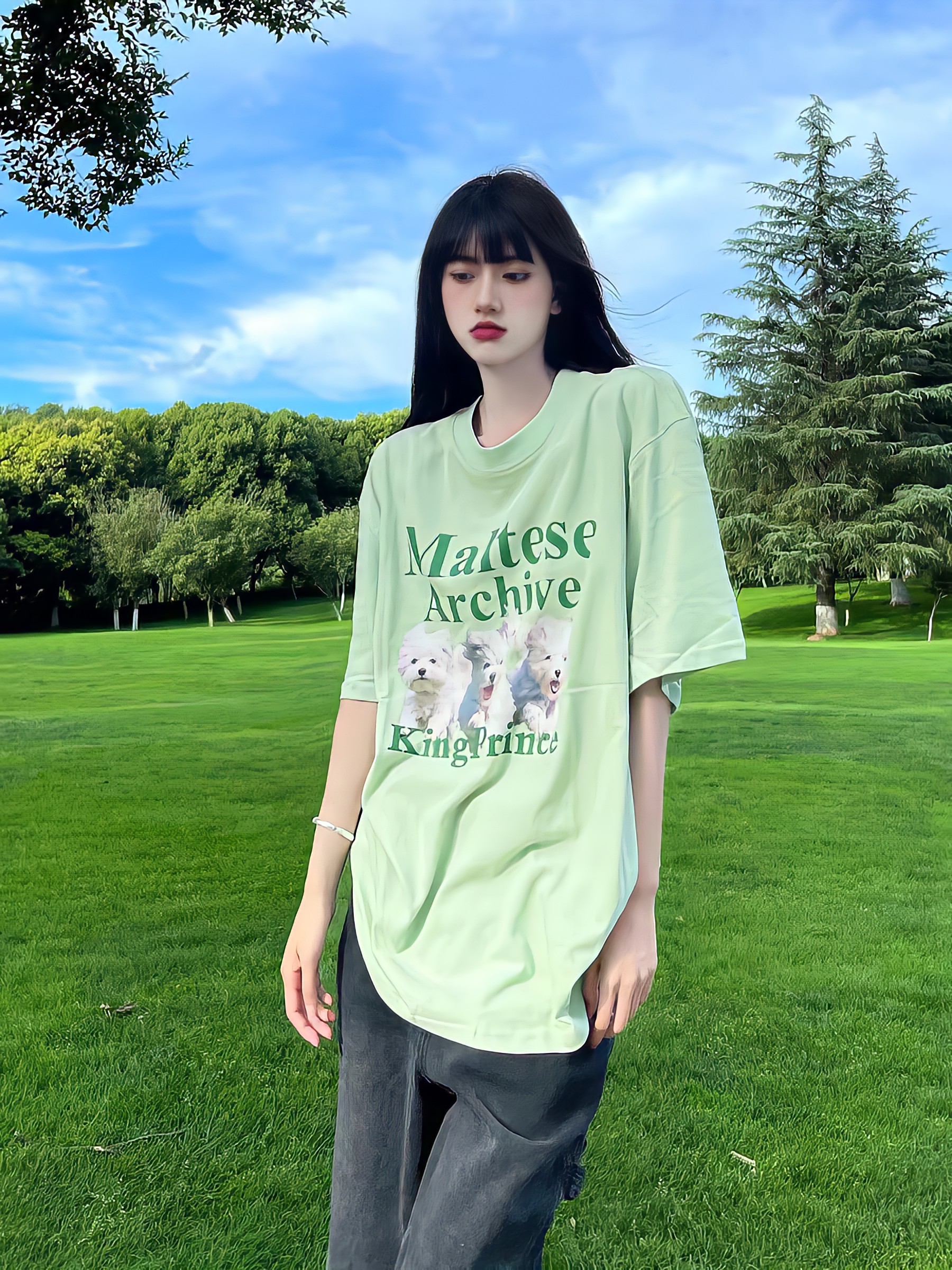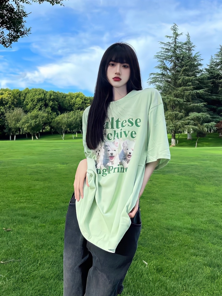小狗图案很是Q萌,绿色的字母印花也比较洋气,宽松落肩袖版型,让多种身材的女生都能轻松驾驭。