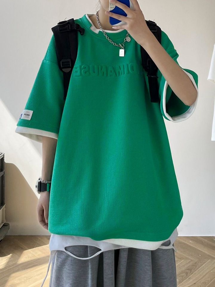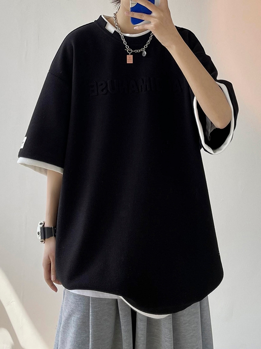 与纯色的衣身形成撞色对比,营造出假两件的视觉效果,可以买来做情侣装,女生穿上很有BF风,走在街上吸睛度超高的。