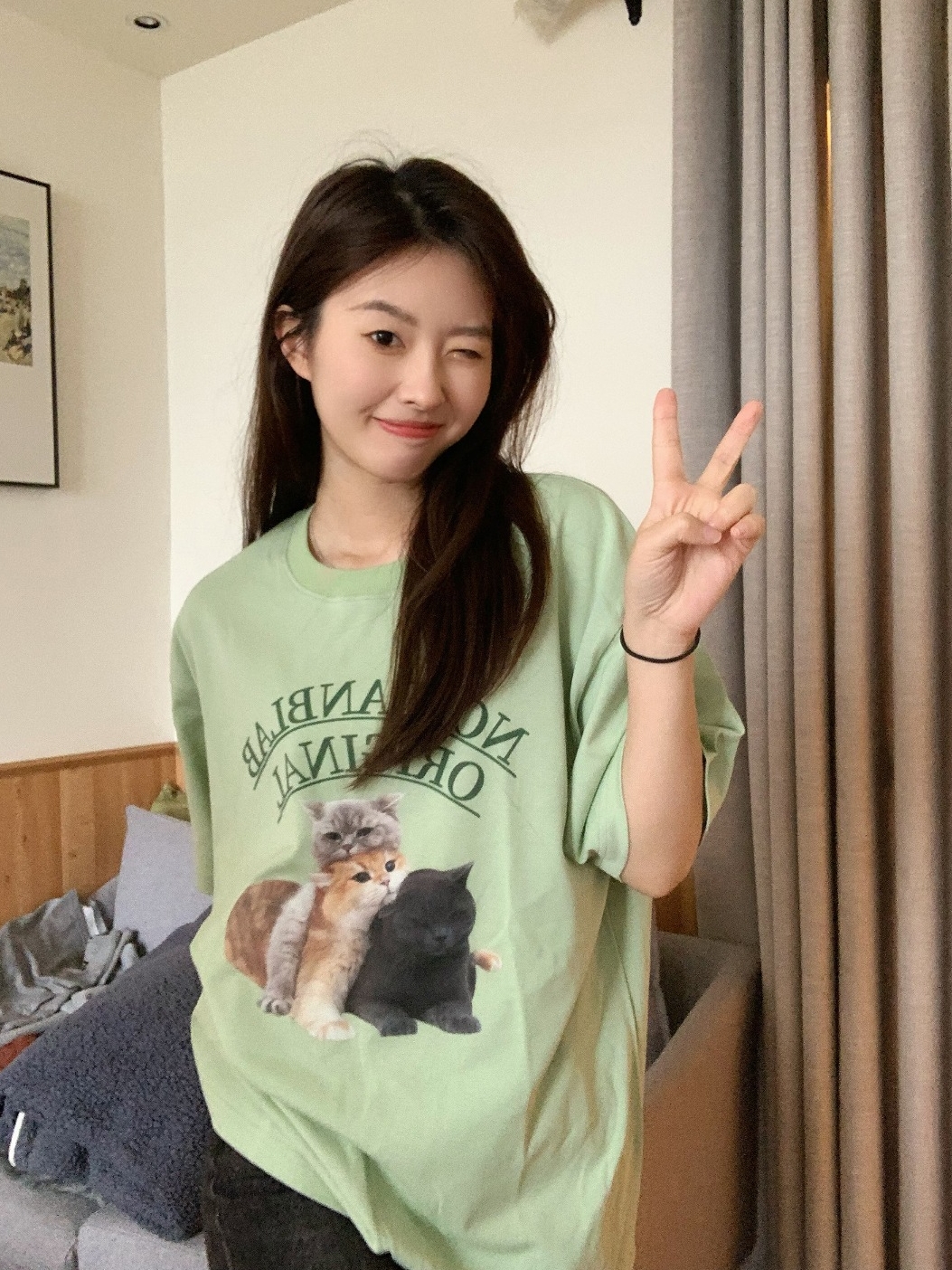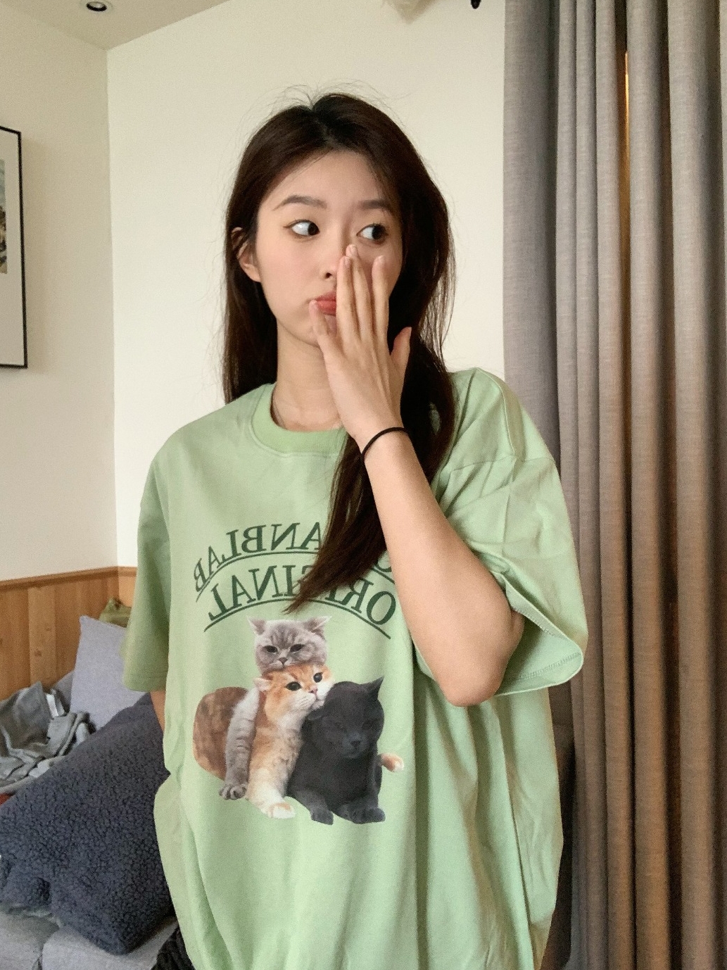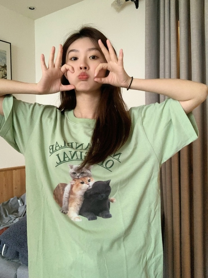T恤是比较中性的,不管是男女都能穿着,作为情侣装也是很不错的选择,女生穿着是属于中长款的长度,慵懒感十足。