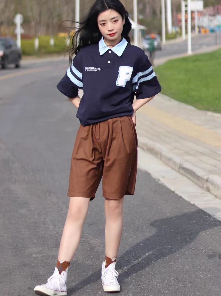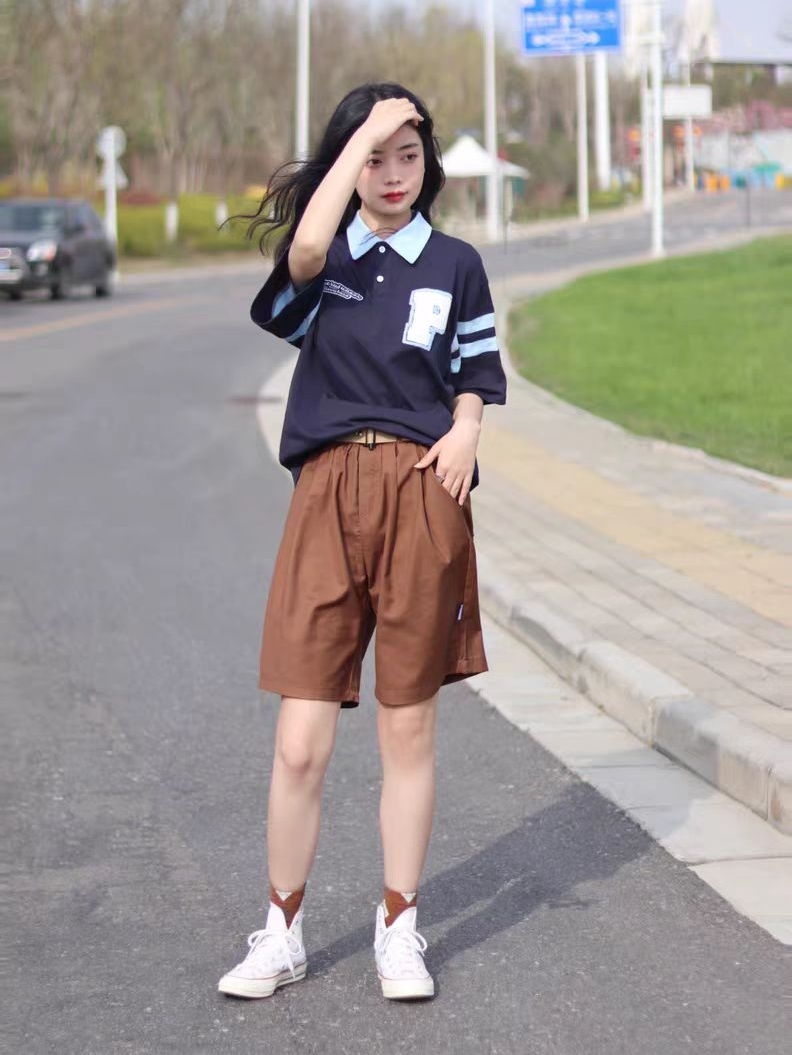 工装版型的五分裤的裁剪,宽松的阔腿裤型,露出小腿的部位,具有显瘦显高的视觉效果,上身有着率真的中性风。