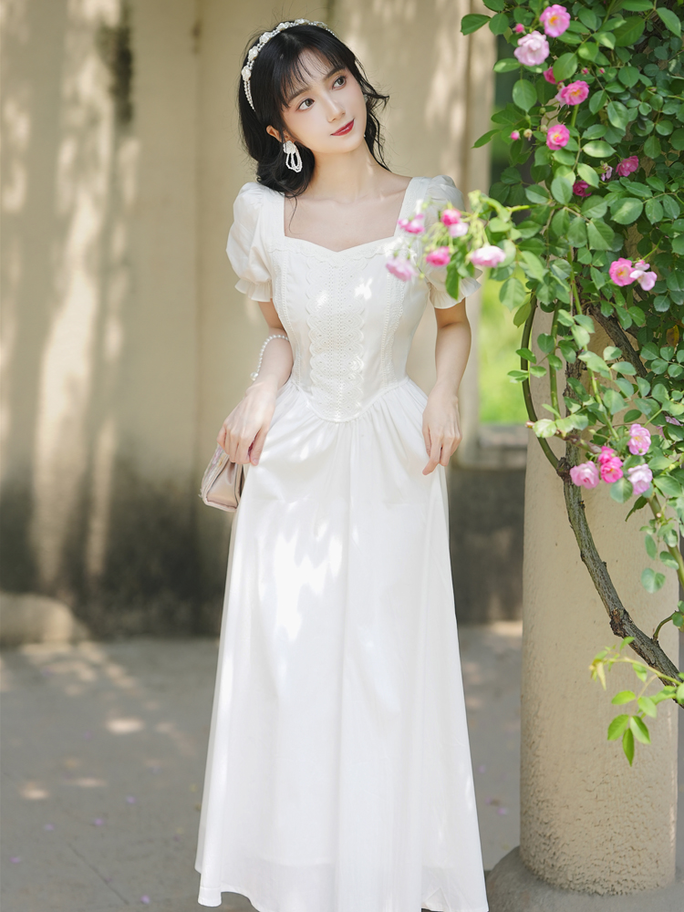赫本风的白色长裙,收腰设计,让穿着者看起来比较有精神气儿,会多一些干练的感觉。棉质条纹裙身,干净大方,大A裙摆,很显气质,是春夏之选。