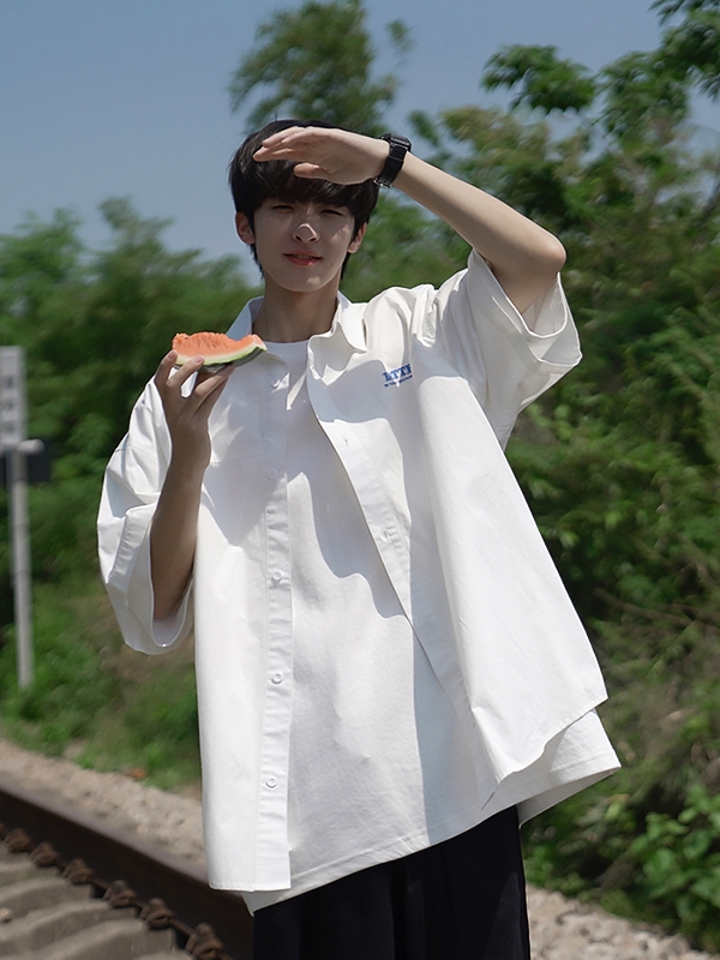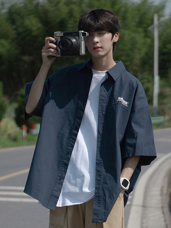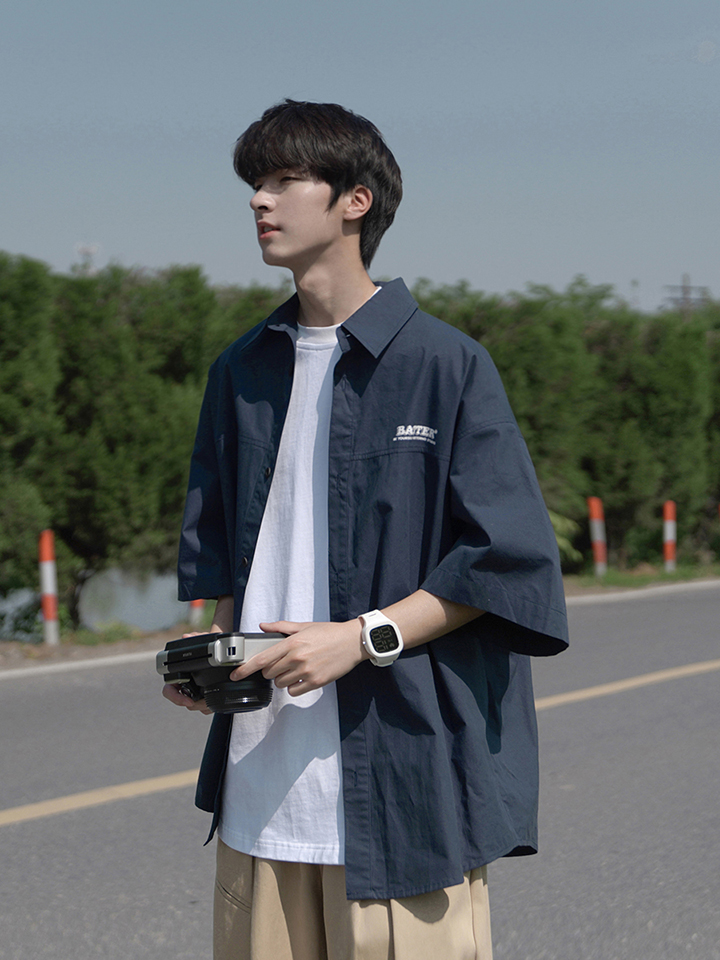 日系风格的一款简约衬衫,经典的小翻领,配合休闲大气的落肩袖造型,穿着轻松自在,慵懒的宽松版型,大胆的纯色洋溢着青春的热情与活力,胸前点缀的字母印花,活力四射。