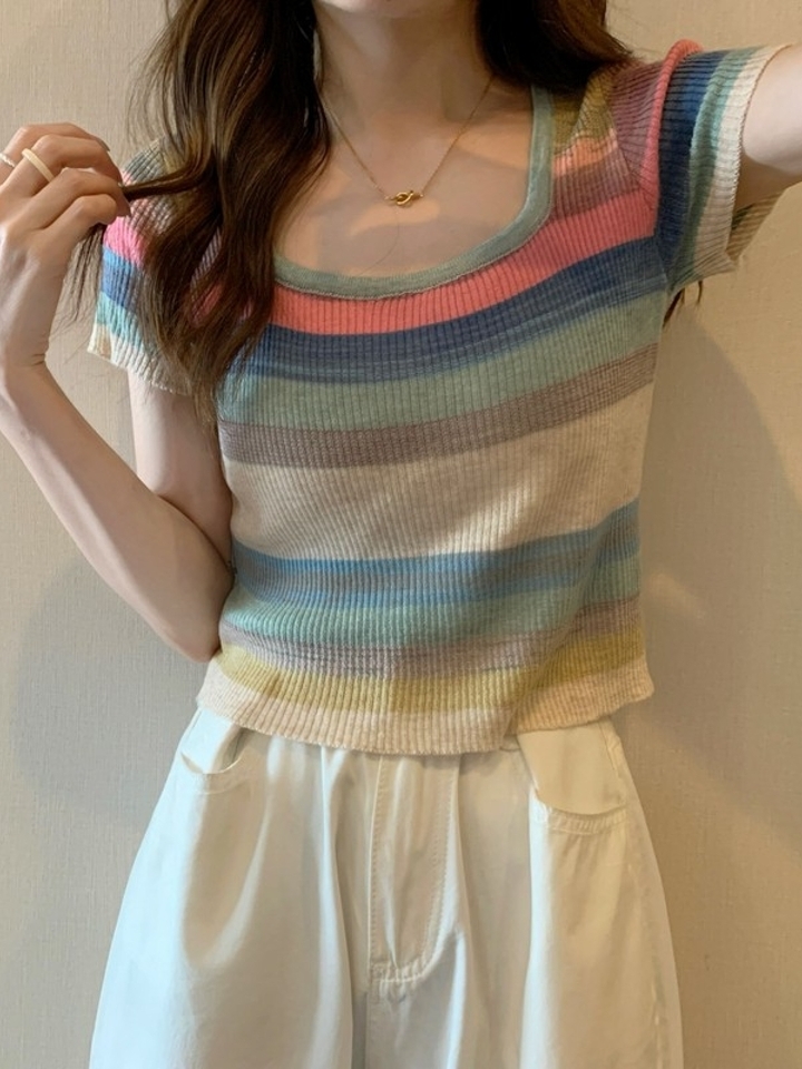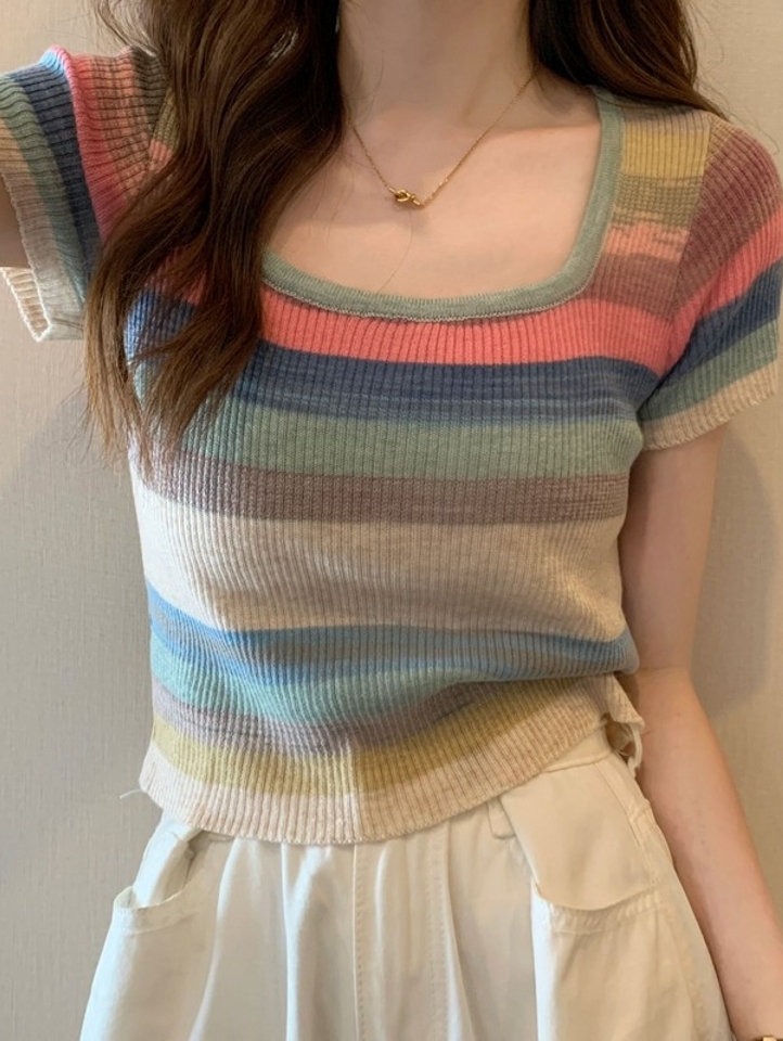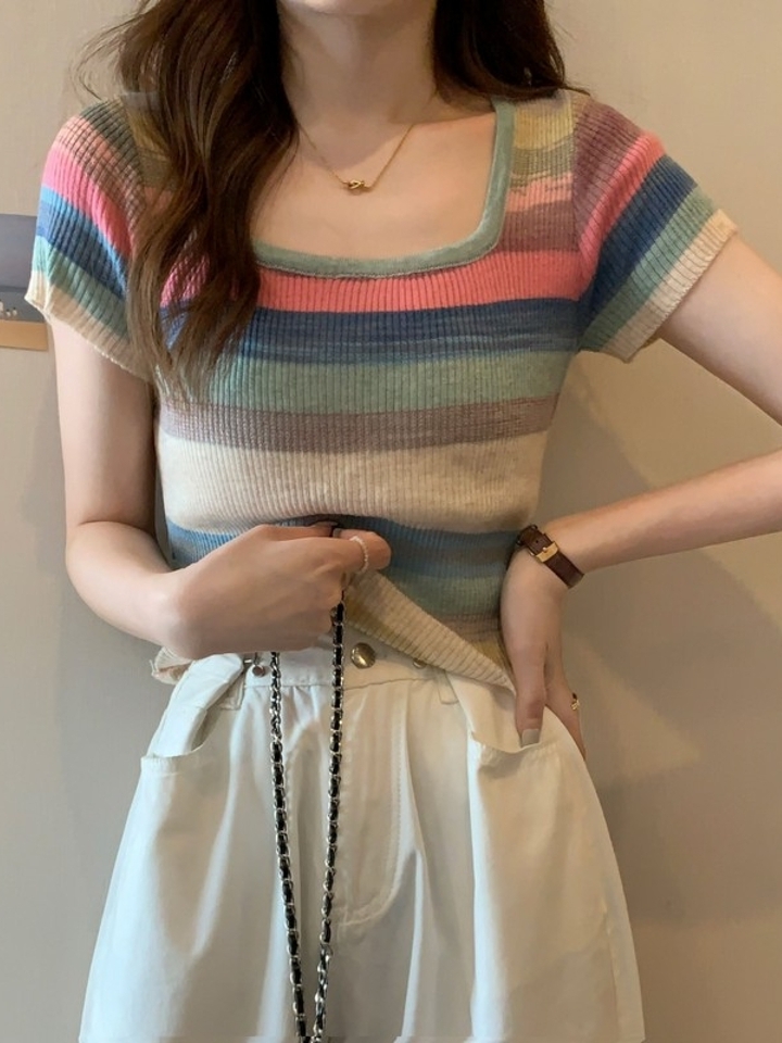 条纹短袖穿起来显瘦好看,方领的设计很漂亮,上身很有气质,整体效果非常的不错,非常的满意