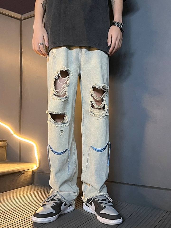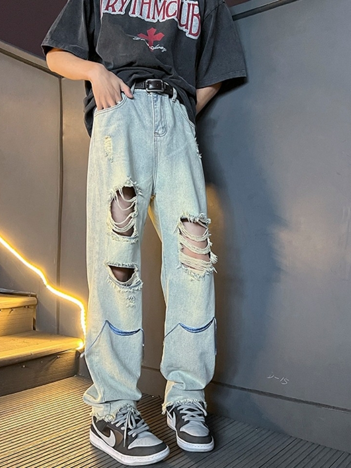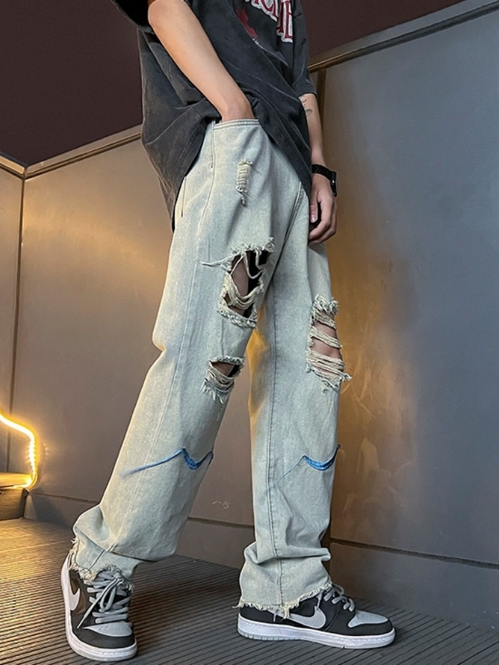 此款牛仔裤的设计亮点在于裤身的乞丐风破洞裤版型,哈伦风版型,修饰腿型拉长线条,营造大长腿既视感。