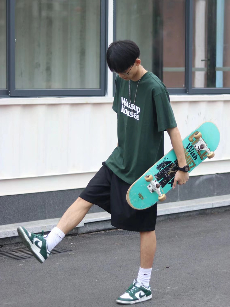 选用了墨绿色的的基调,结合撞色字母印花,轻松打破了衣身的单调。宽松的衣身设计,增添时尚气息。