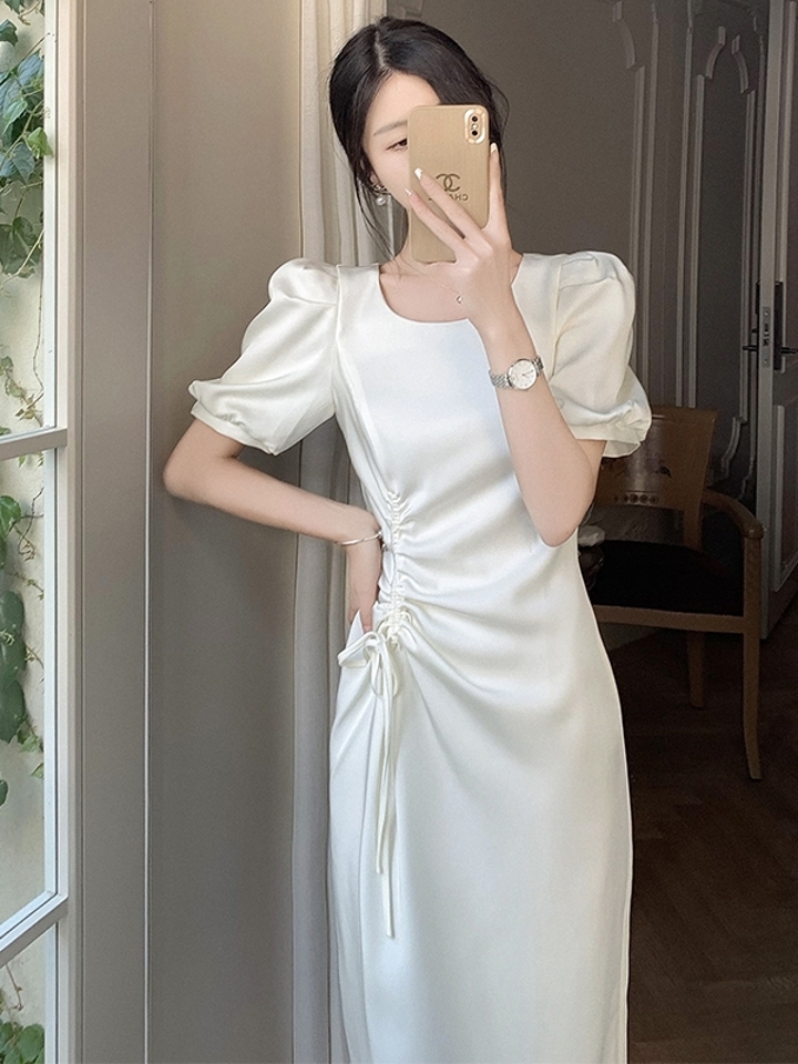 白色收腰连衣裙舒适的聚酯纤维腰部衬托出纤细纤细的腰部,展现完美身材。