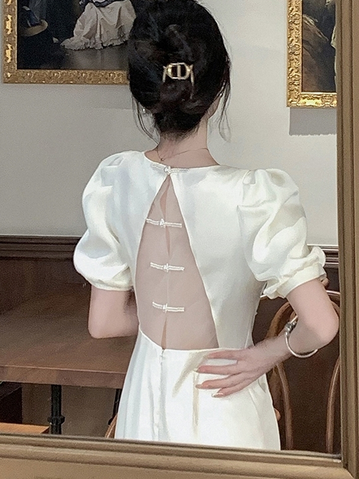 这件白色连衣裙的处理显示出俏皮可爱的气质。这件连衣裙的底色很清新,很精致!