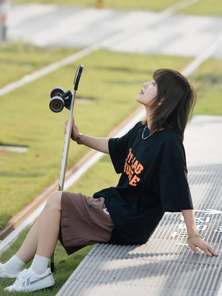 平时搭配的话,我会选择一条棕色宽松短裤作为下搭,再来一双白色的板鞋,看上去休闲又能遮肉显瘦,还有日系学妹即视感。