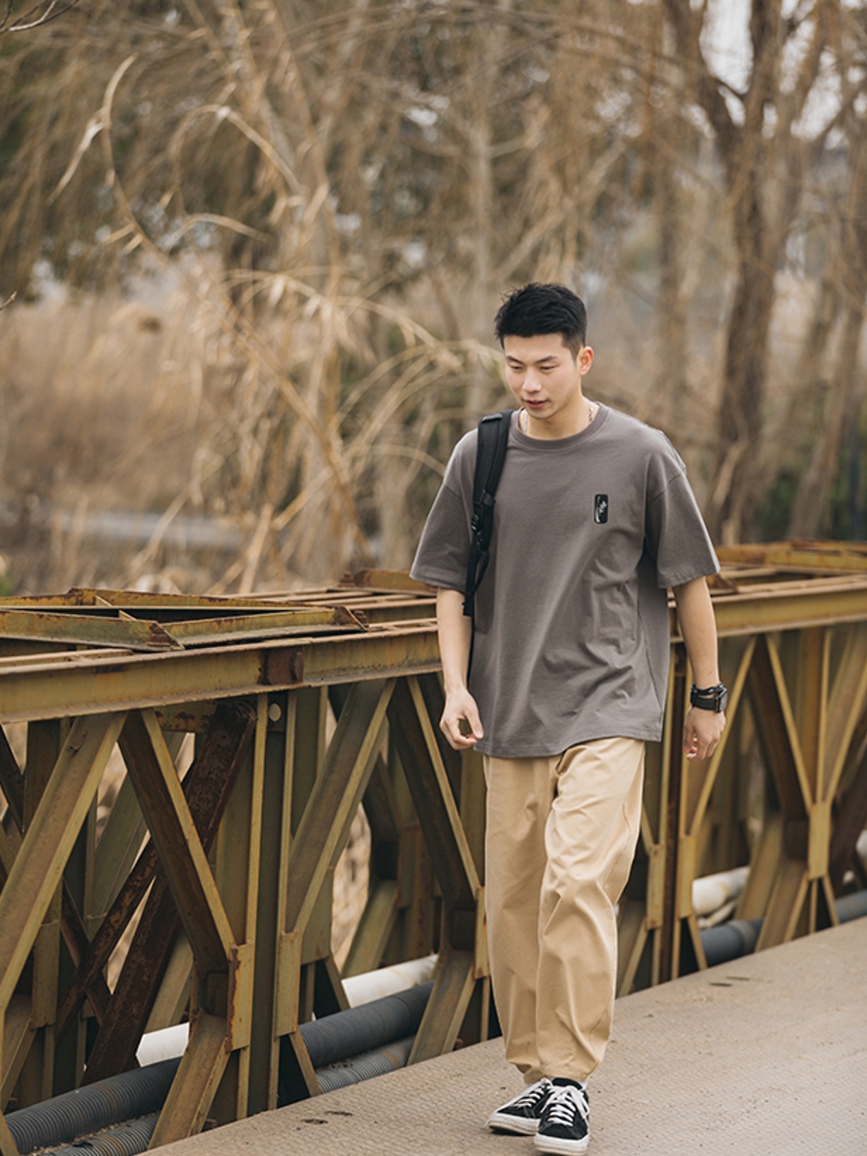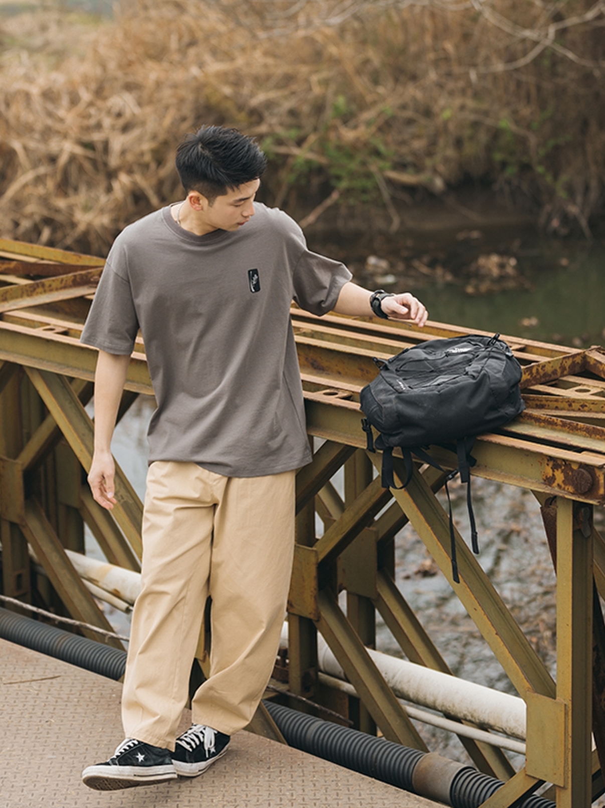潮流又显复古味的休闲裤,.上 身搭配港风的n印花短袖衫,轻松穿出男士的清新味道,脚上穿n休闲的高帮帆布鞋,随性将阳光帅气的形象穿出n来。