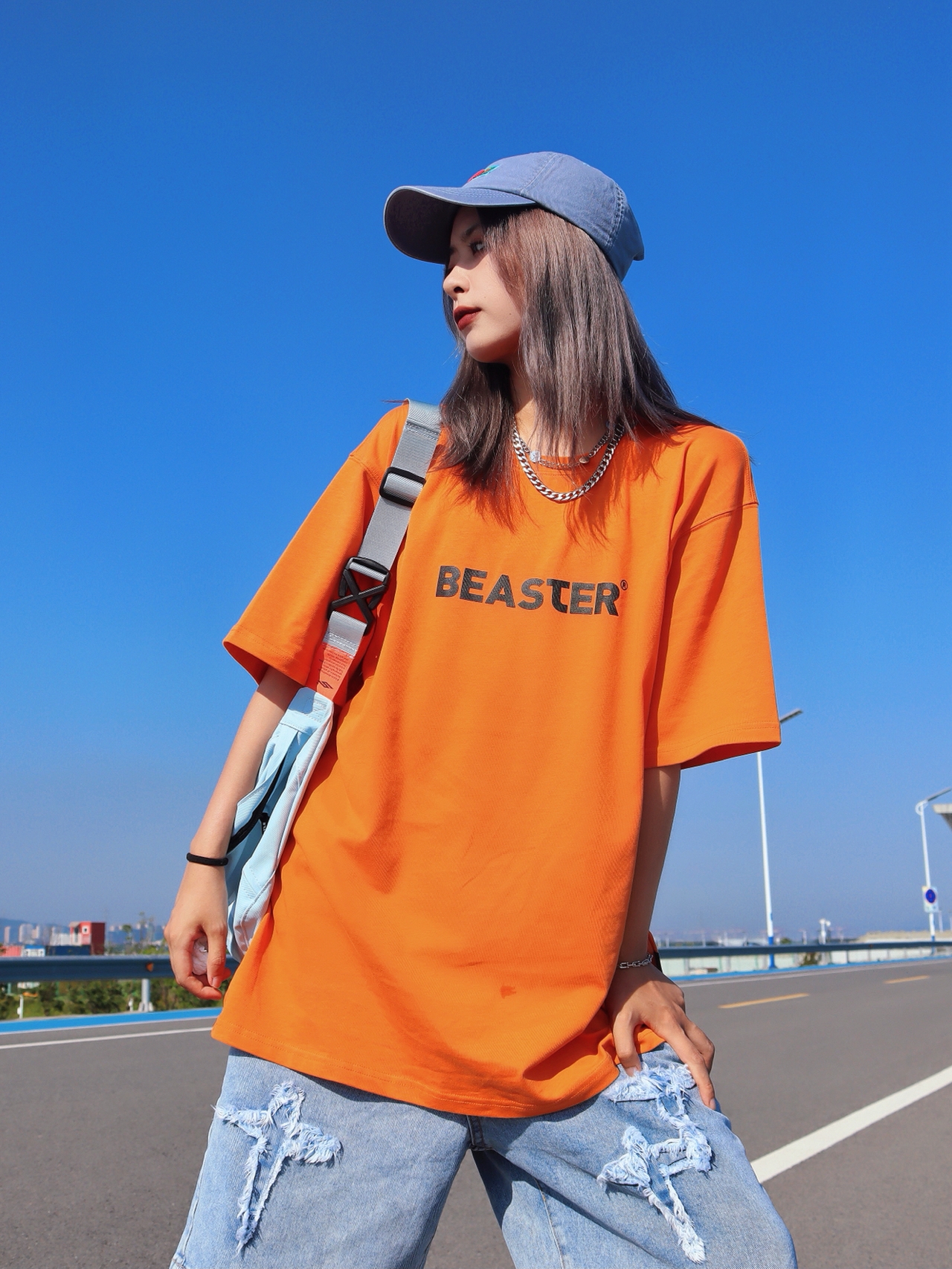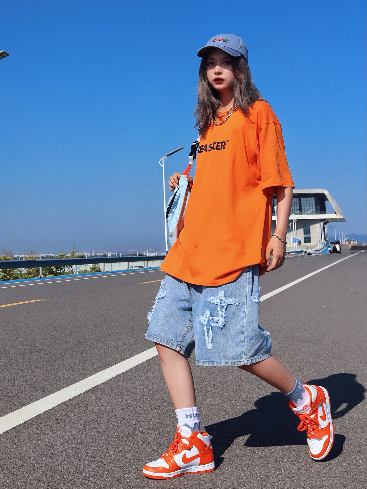 看我像不像一颗行走的大橘子?橙色和牛仔蓝搭配简直封神!橘色和蓝色本身就是对比色系所以这两个颜色的单品搭配在一起绝对好看,这一套的少年感更要足啦!橙色和蓝色怎么会这么搭啊?棒球帽和牛仔裤搭配也是无敌!