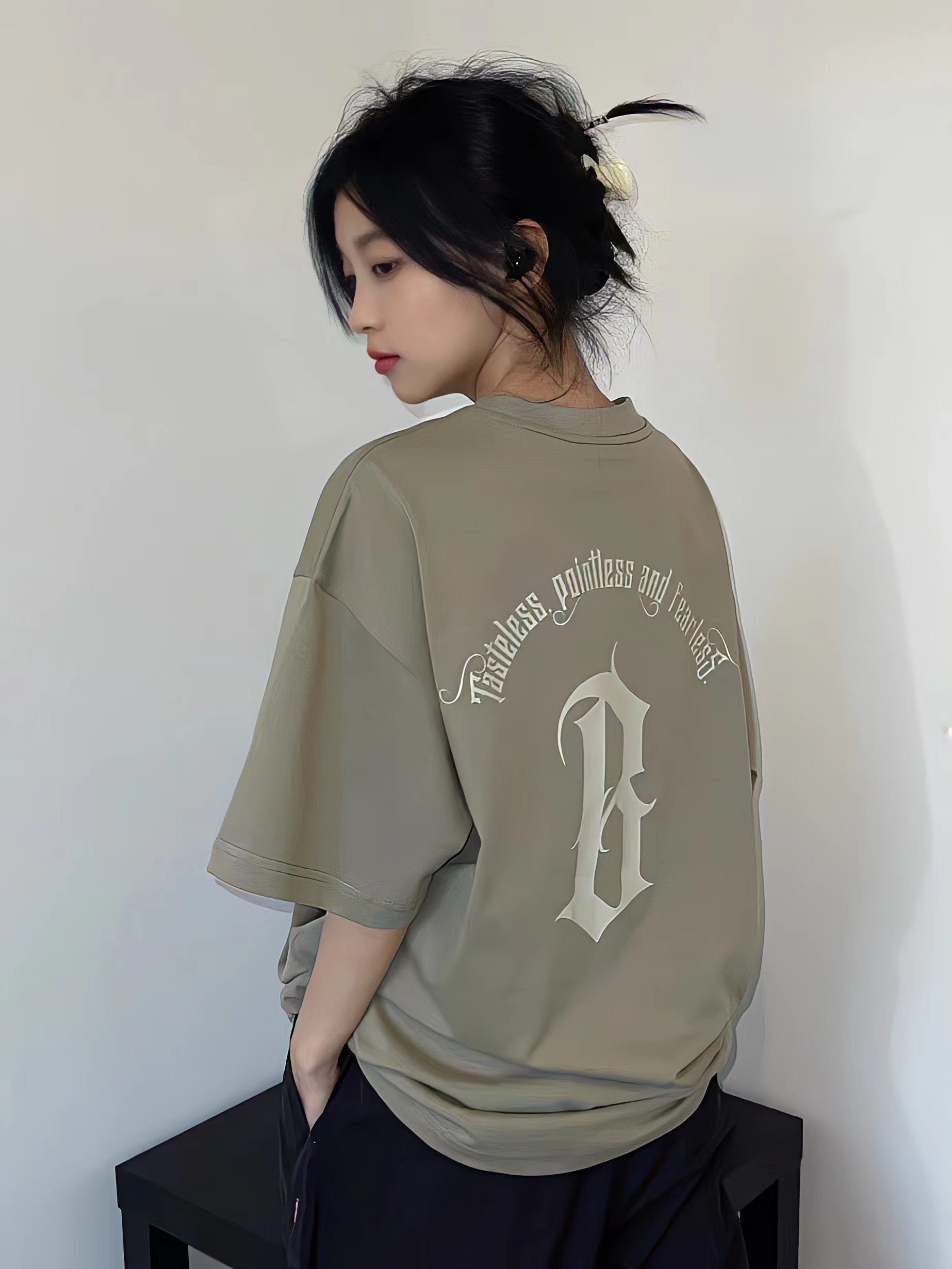 背部的字母B和其它英文小字母融入,丰富了整体的时尚潮流感,还带出了些许和谐美感,宽松的版型剪裁,慵懒又随性。