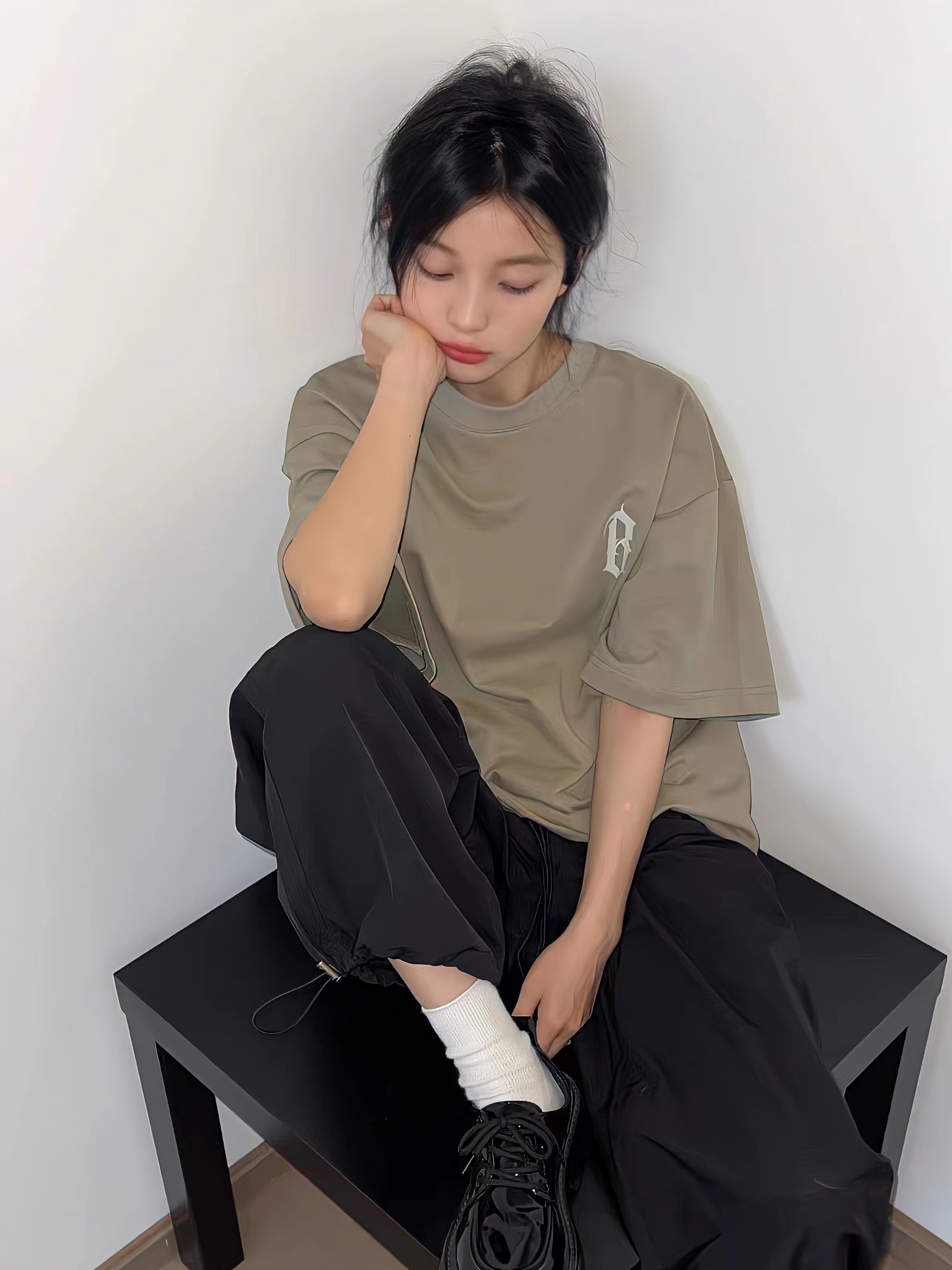 圆领的款式,简单又大方,搭配起来也是毫不费力,下搭一条宽松的黑色阔腿休闲裤,再配上一双老爹鞋,显得青春又不失时尚感。