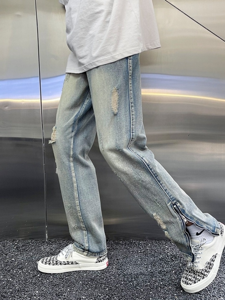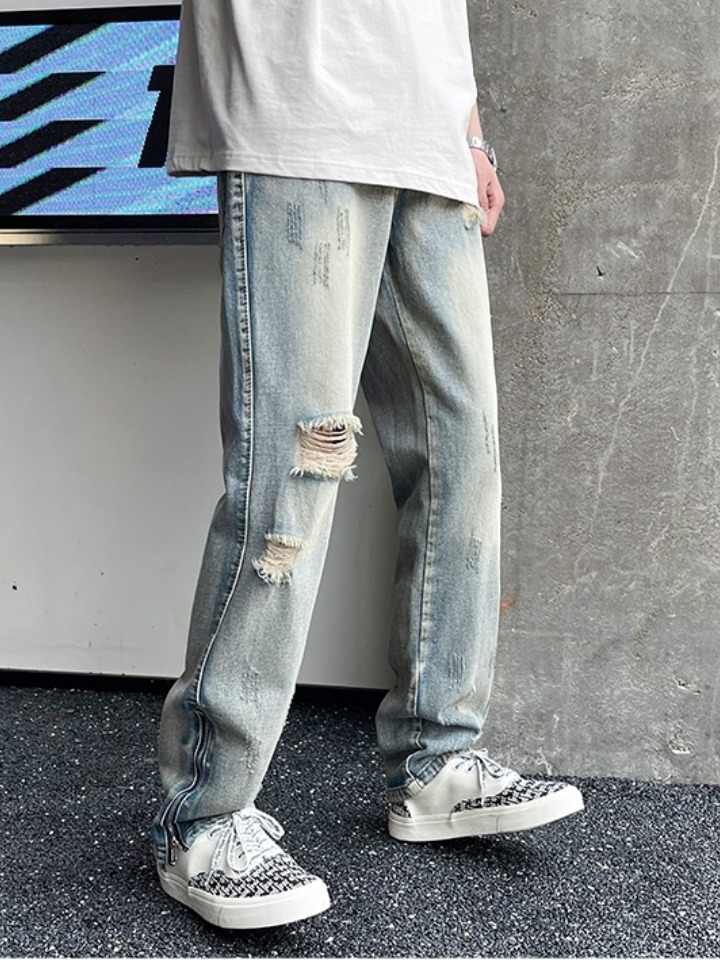 触感细腻,不易退色,穿着无刺激感。经过水洗工艺技术,更显复古旧感。破洞做旧设计,增加趣味