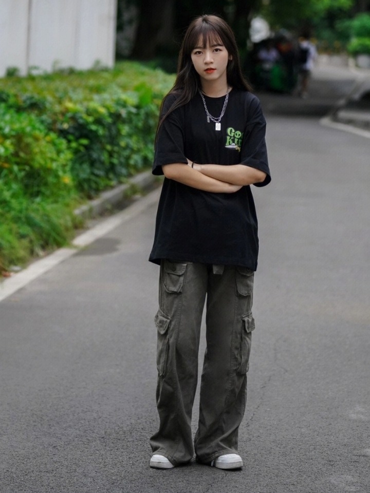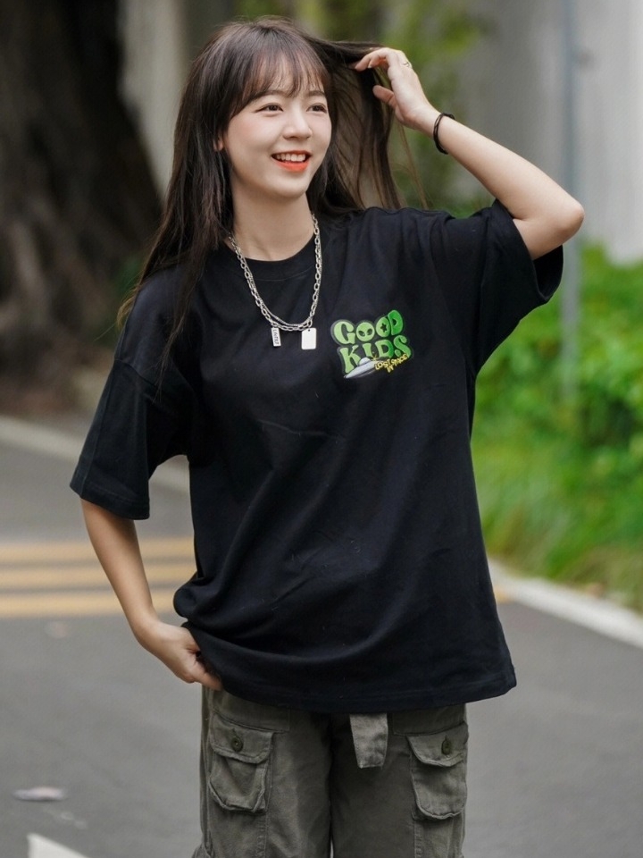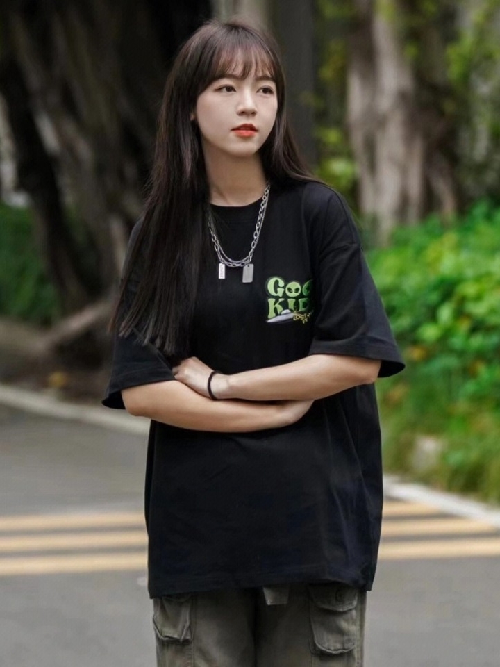 这款T恤好百搭,日常我很喜欢穿它出门,我会在搭配一条工装裤,穿上一双休闲鞋,这样就显得很时髦了呢。
