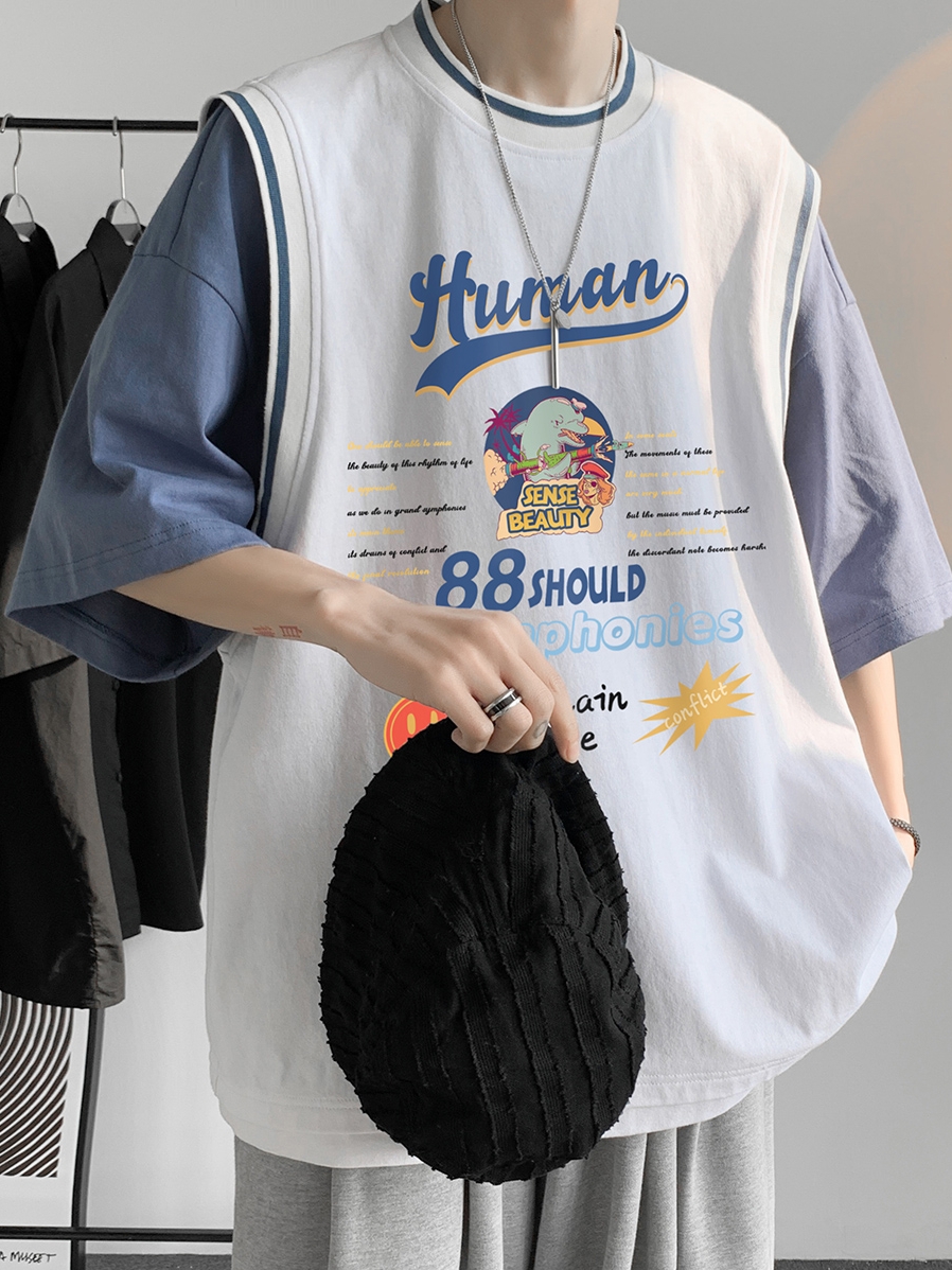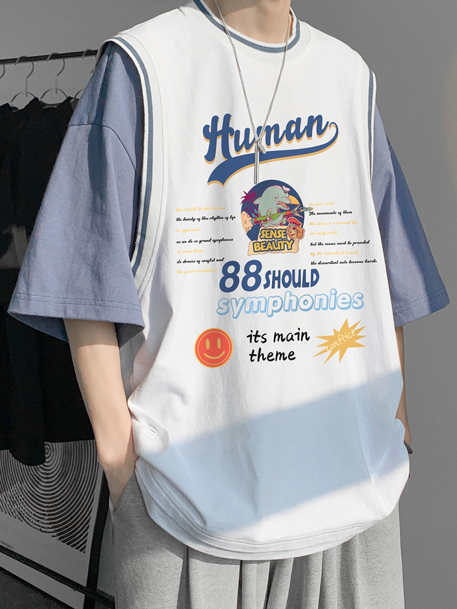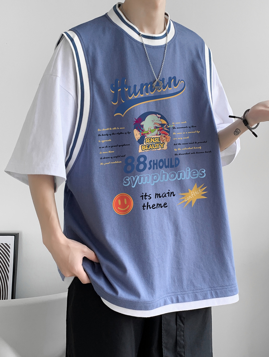 衣身采用假两件的版型设计,蓝灰白两色相互碰撞,凸显层次效果;依照半袖的版型裁剪,宽松的袖口,给予舒适自如的穿着体验。