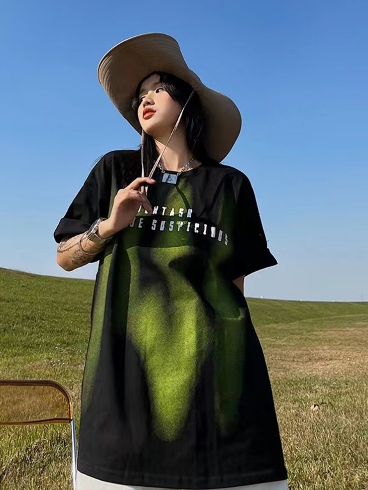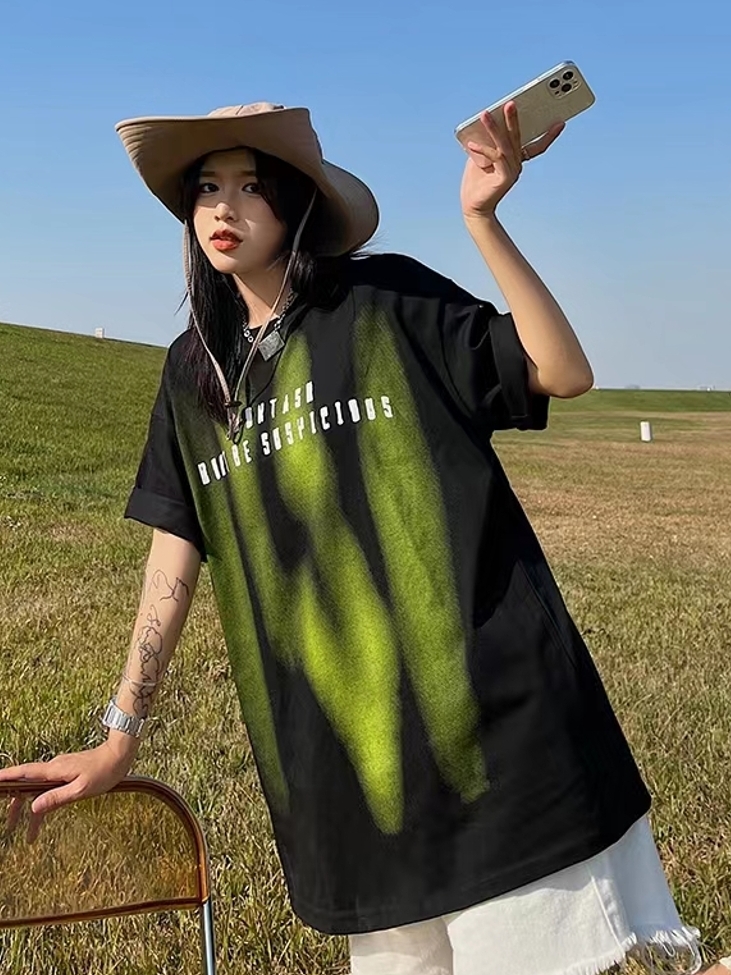 街头感的一款T恤,宽大的版型,上身舒适,也很有型,不挑身材穿,字母图案印花设计超级带感,街头感十足。