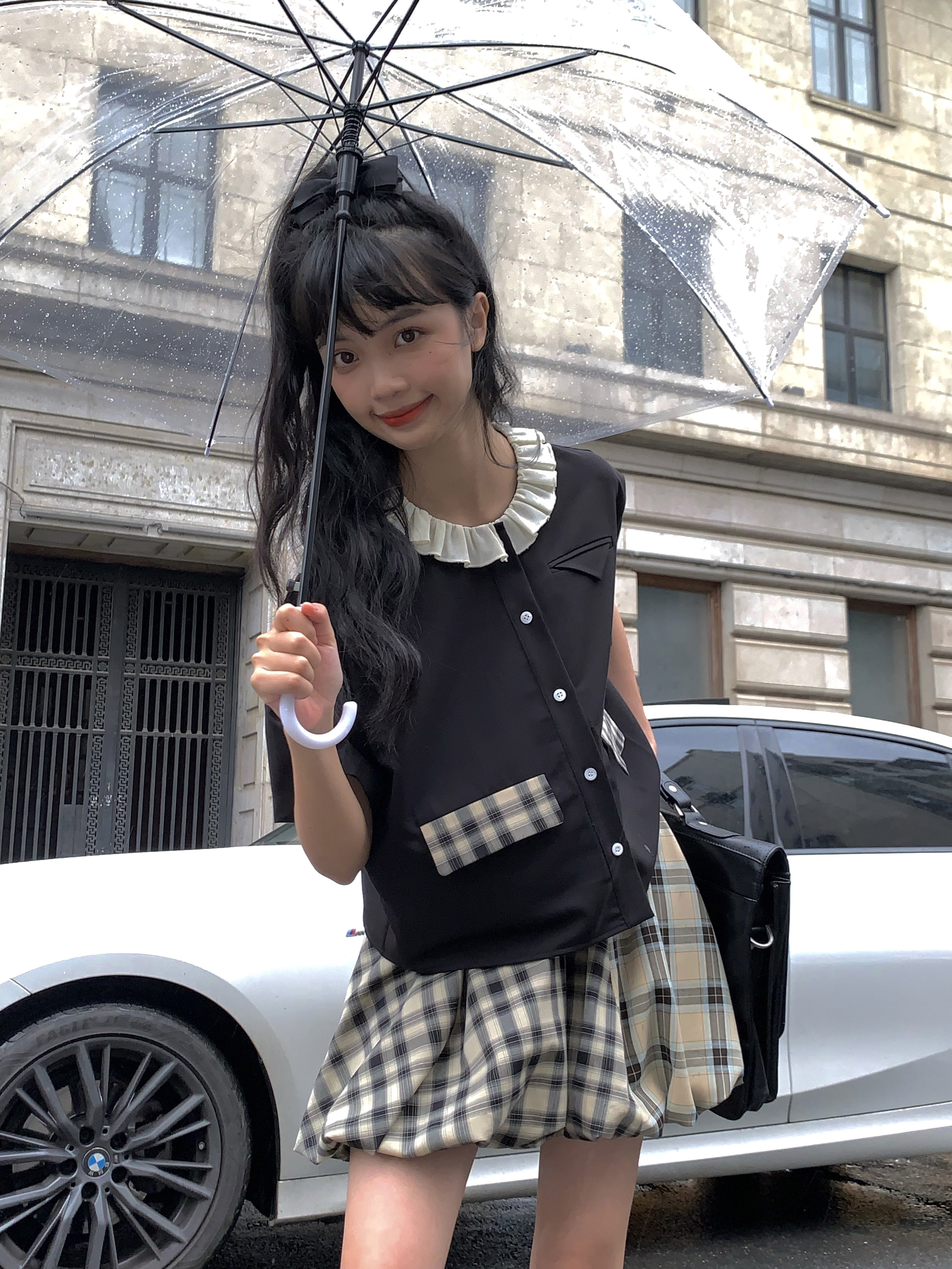 带着浓浓英伦学院风的一款套装,圆领加上木耳花边的装饰,给人乖巧可爱的感觉。两侧格子翻盖口袋的装饰,增添了造型层次感。