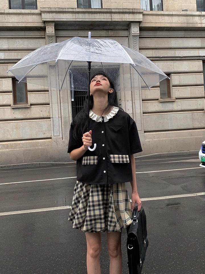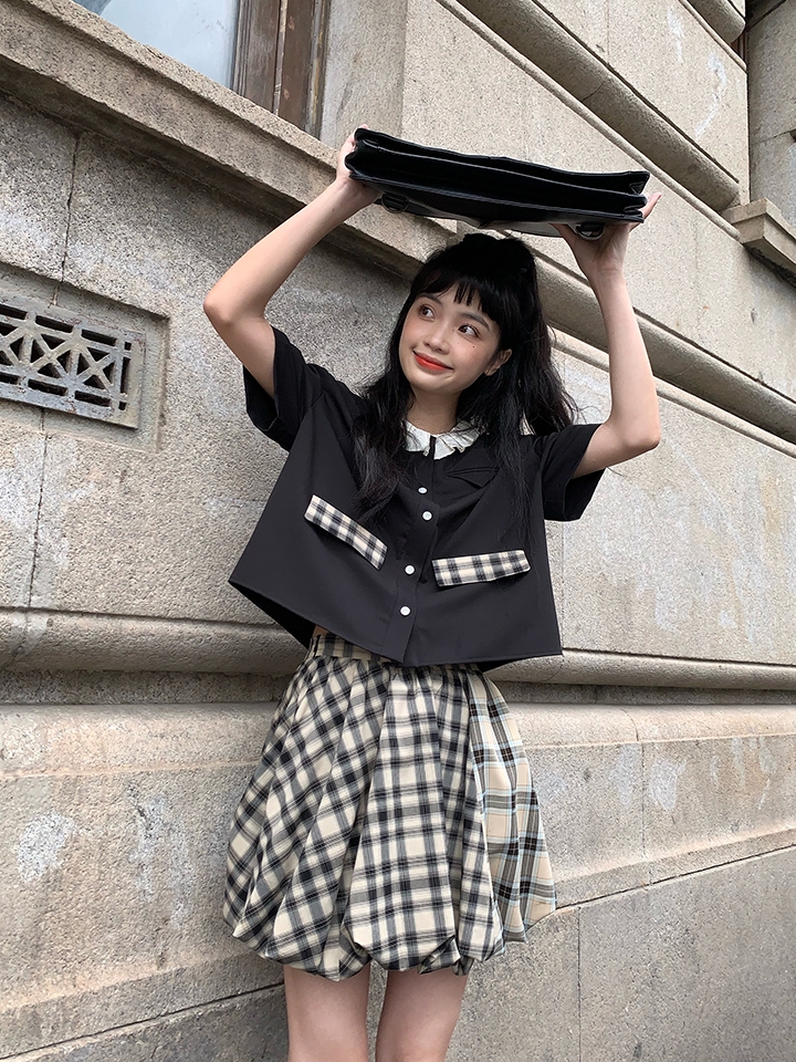 上衣是小短款的款式,版型比较宽松,对身形有很好的修饰效果,搭配格子半身裙,给人活泼可爱的感觉,上身超级减龄。