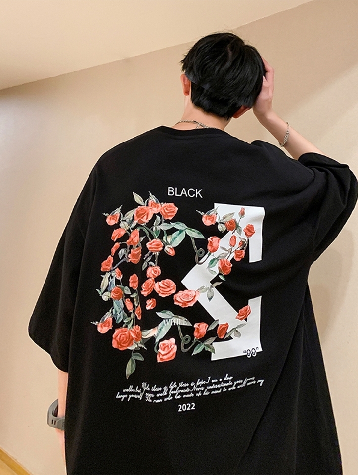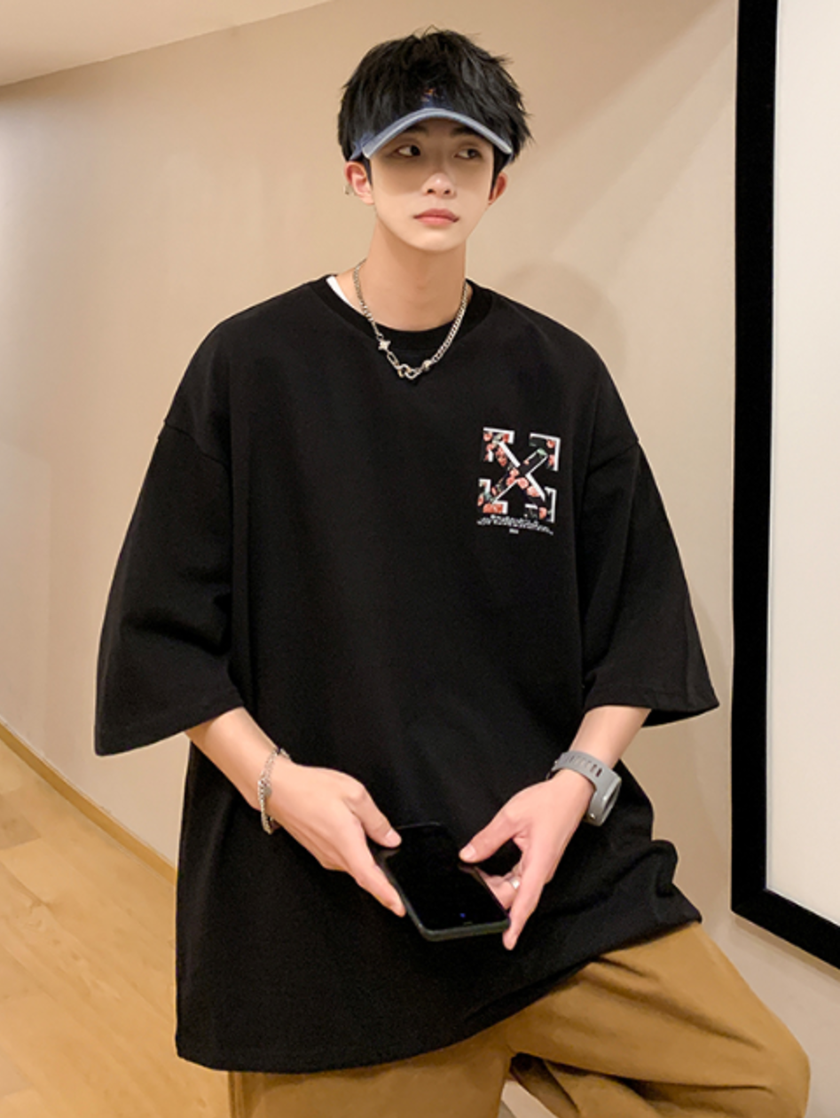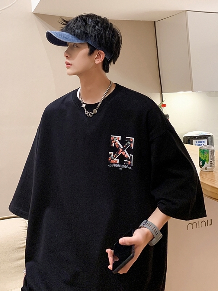 宽松的版型,非常的帅气,有型。个性的字母印花设计,潮范儿十足,时尚百搭,简约随性,新颖的圆领设计更显时尚大方。