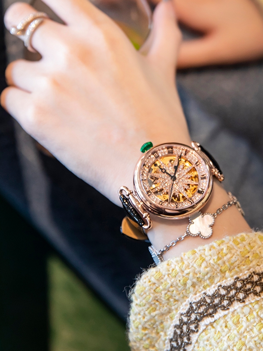 表壳采用椭圆形不锈钢外环配以玫瑰色涂层,12点的位置饰有天鹅标志。