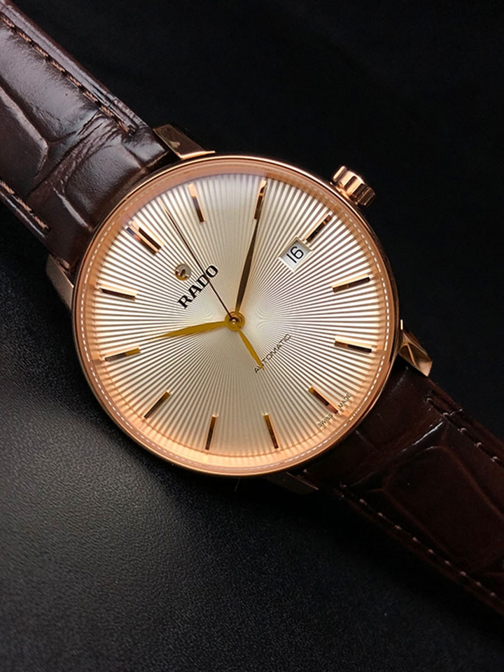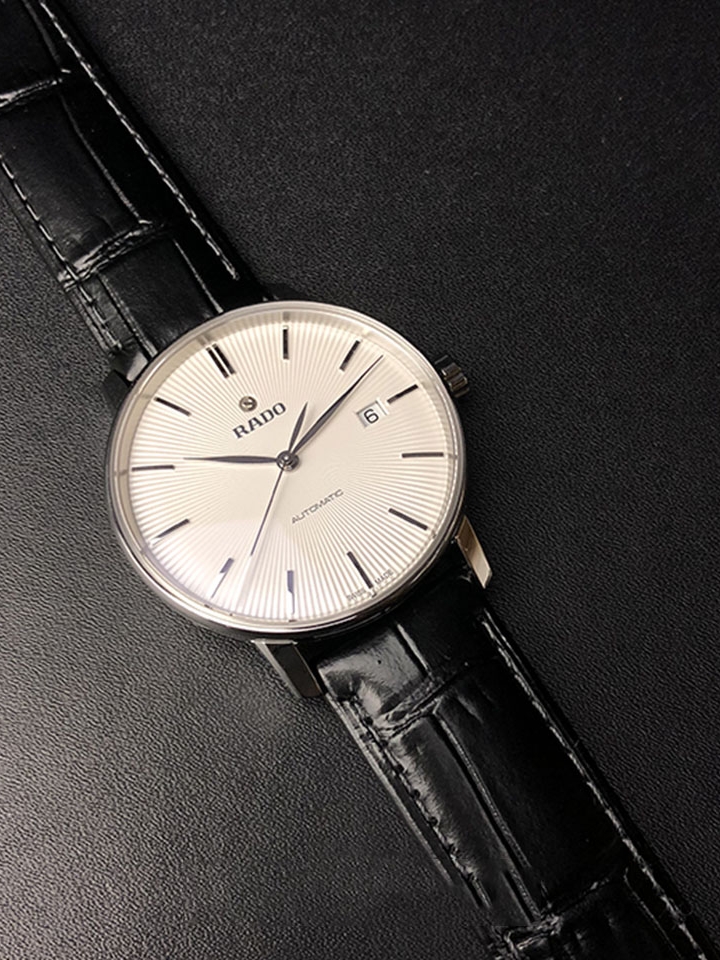 表冠位于腕表3点位置,边缘采用齿轮纹设计,顶部刻有雷达标识,腕表线条流畅,采用一体式铸成,黑色真皮表带尽显男士优雅。