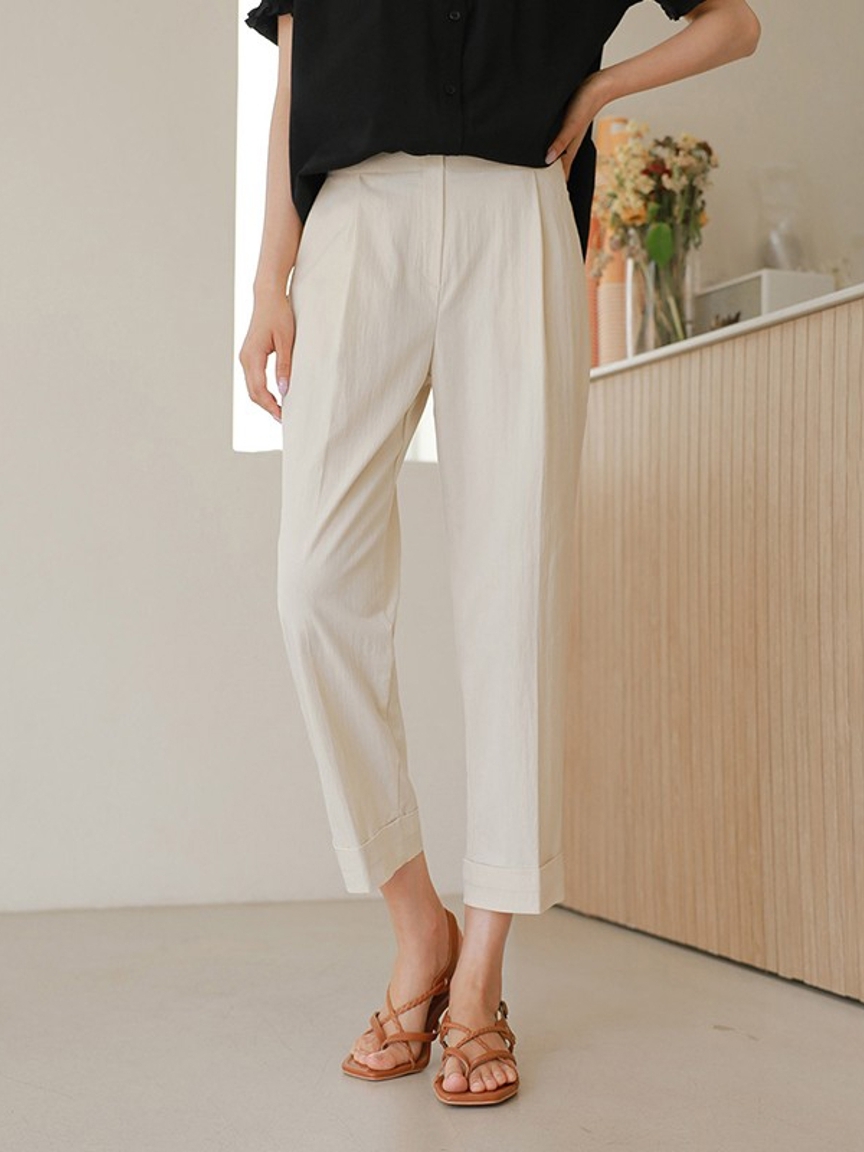 简约的裤型利落的打造出自信干练的气质,高腰的设计拉长了腿部线条,裤腿上的做了压皱线条,立体又显瘦。