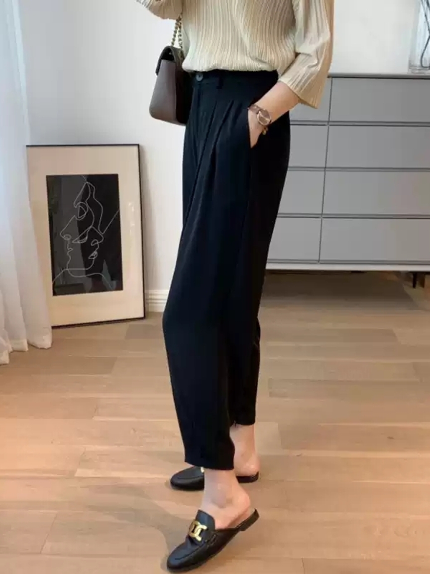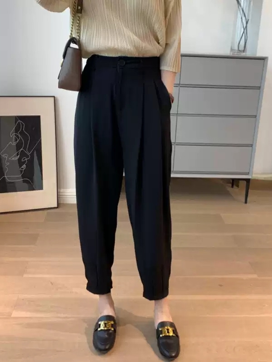 高腰九分裤长度设计,上身显瘦又轻松拉长双腿视觉比例,哈伦裤的版型轻松藏肉显瘦。