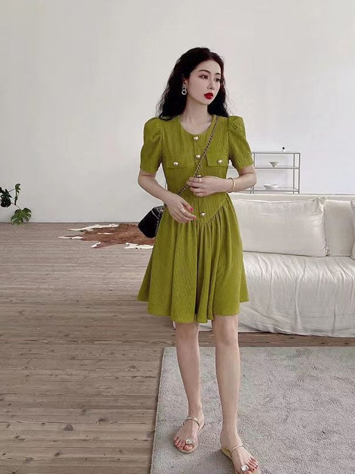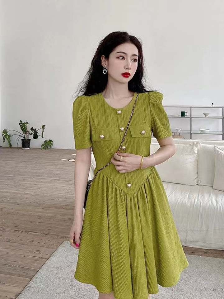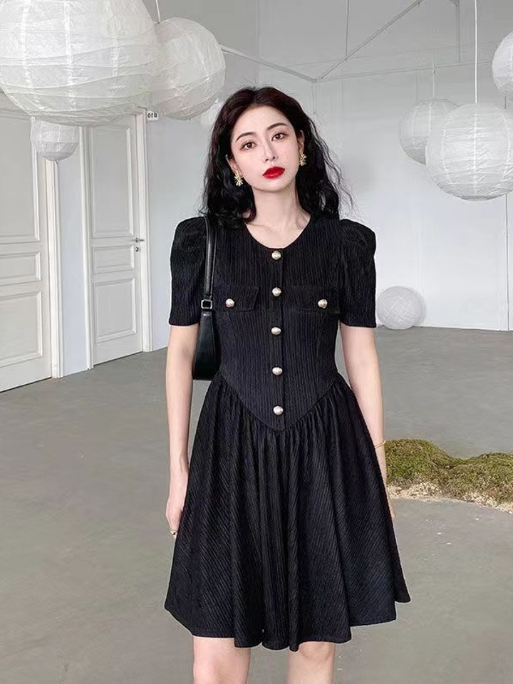 一款十分乖巧的连衣裙,无限减龄,身材娇小的MM,还有让你视觉增高的效果,高腰款,拉长下半身比例,显腿长,下摆压褶处理。