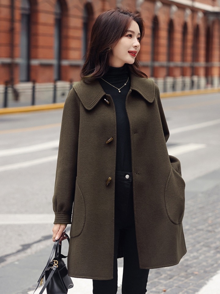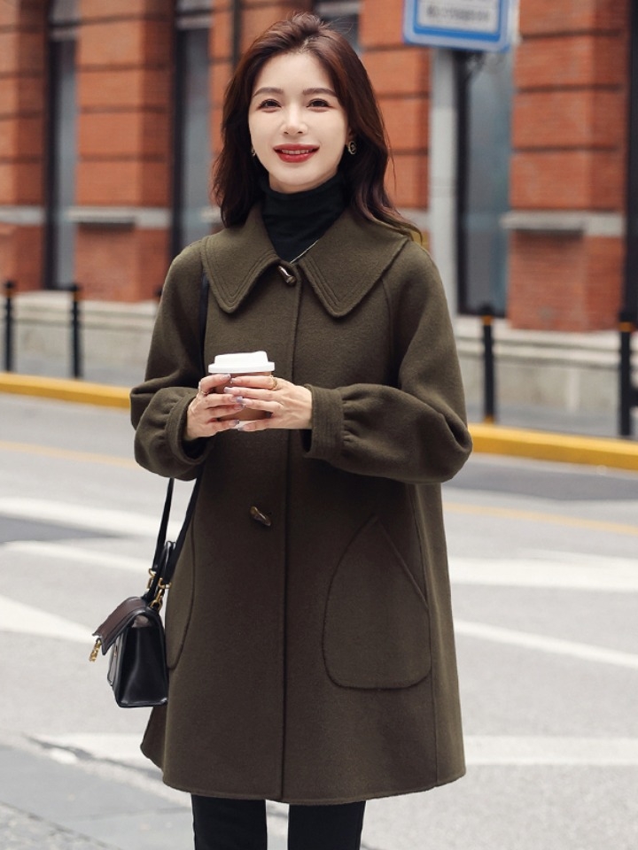 橄榄绿的颜色,复古优雅。精致的娃娃领设计,简约大方,甜美减龄。两个口袋的点缀,美观实用。中长款设计,上身利落有范。