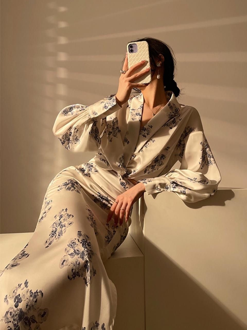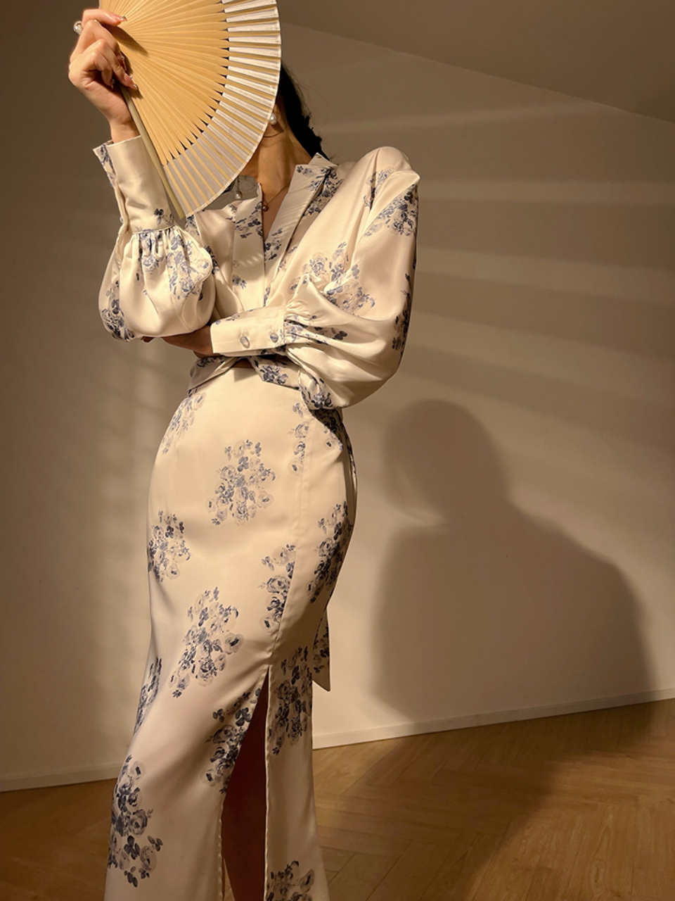 大V领设计,从视觉上显脸小,露出迷人的锁骨脖颈线条,衬衣袖口精致小巧,秋冬作为内搭也是不错的选择。高级水墨感蓝色蔷薇,晕染在淡淡微光的白胚底上,犹如墨色荡在水中。