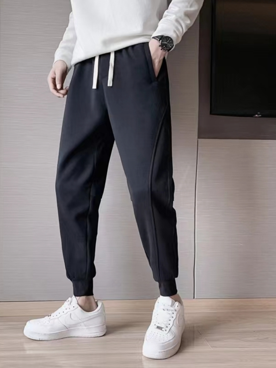 采用优质的加厚弹性面料,配以修身的剪裁,加绒加厚的设计,宽松有型,松紧裤腰,抽绳设计,穿着舒适方便。