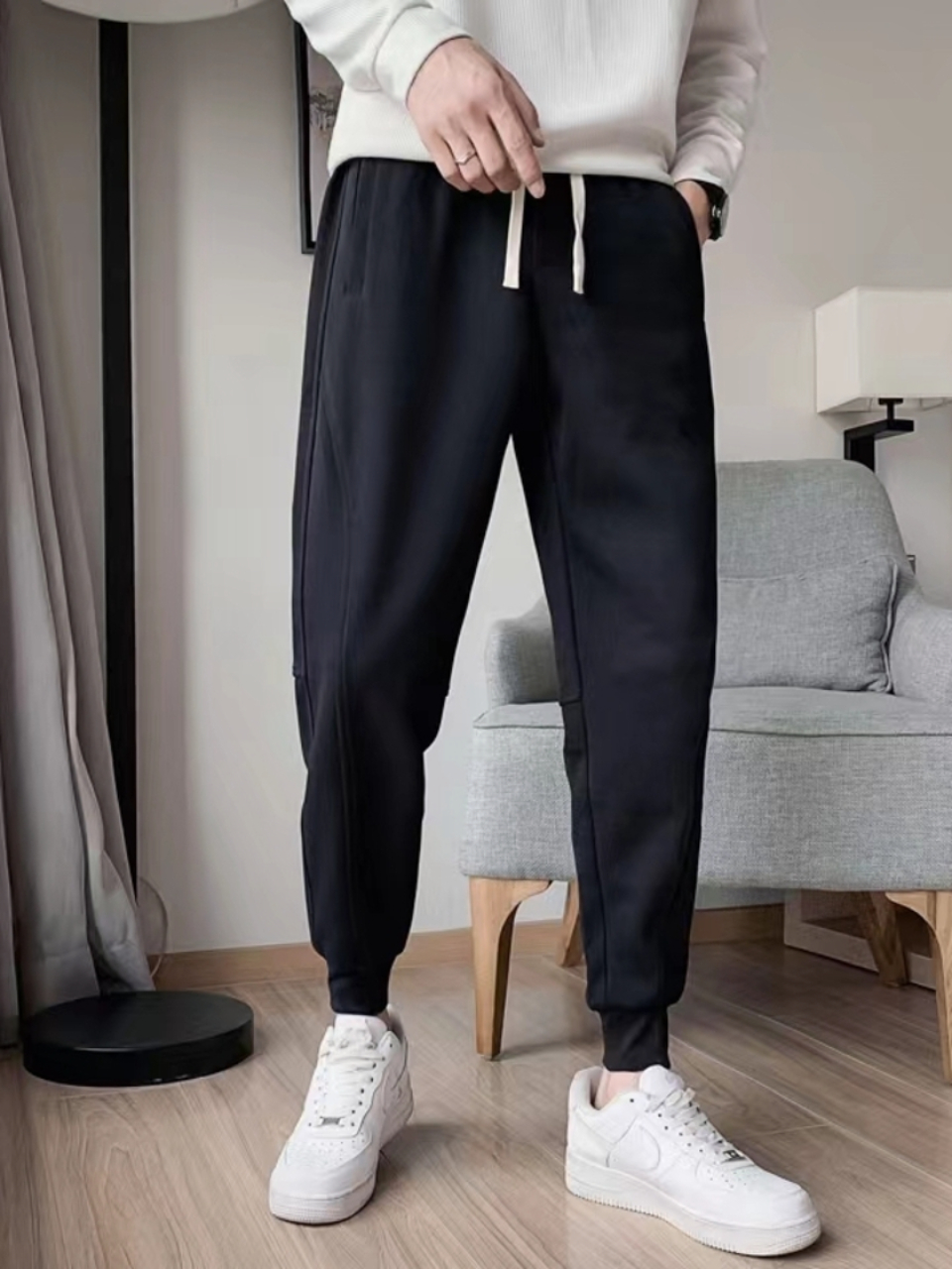 这款卫裤加绒加厚的面料,保暖舒适,手感柔和细腻,裤腰为松紧抽绳设计,宽松度自由调节,束脚的设计具有非常显瘦的效果。